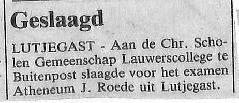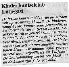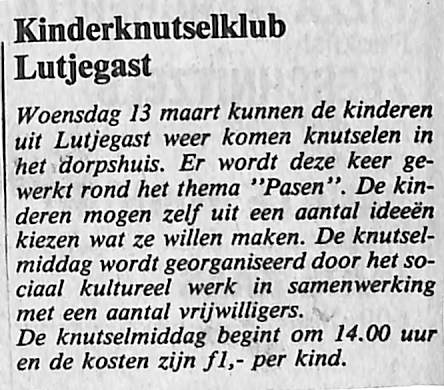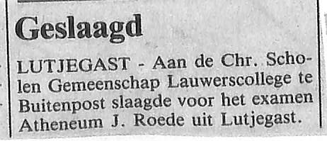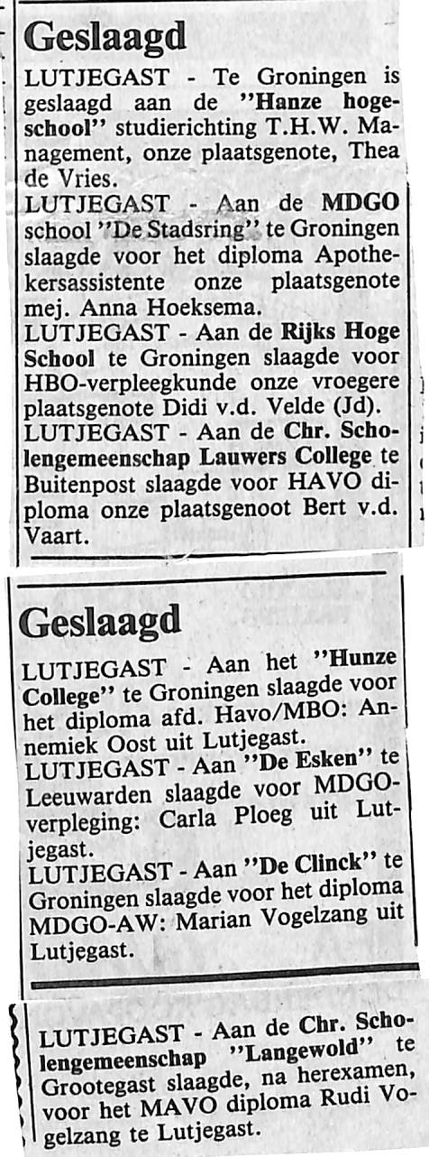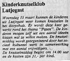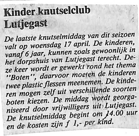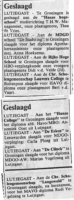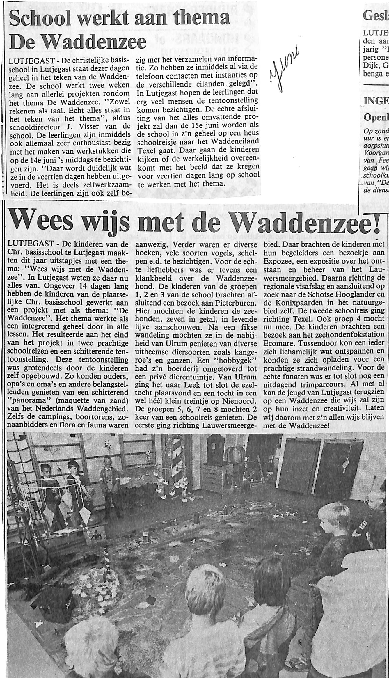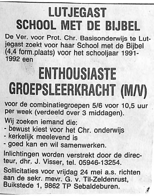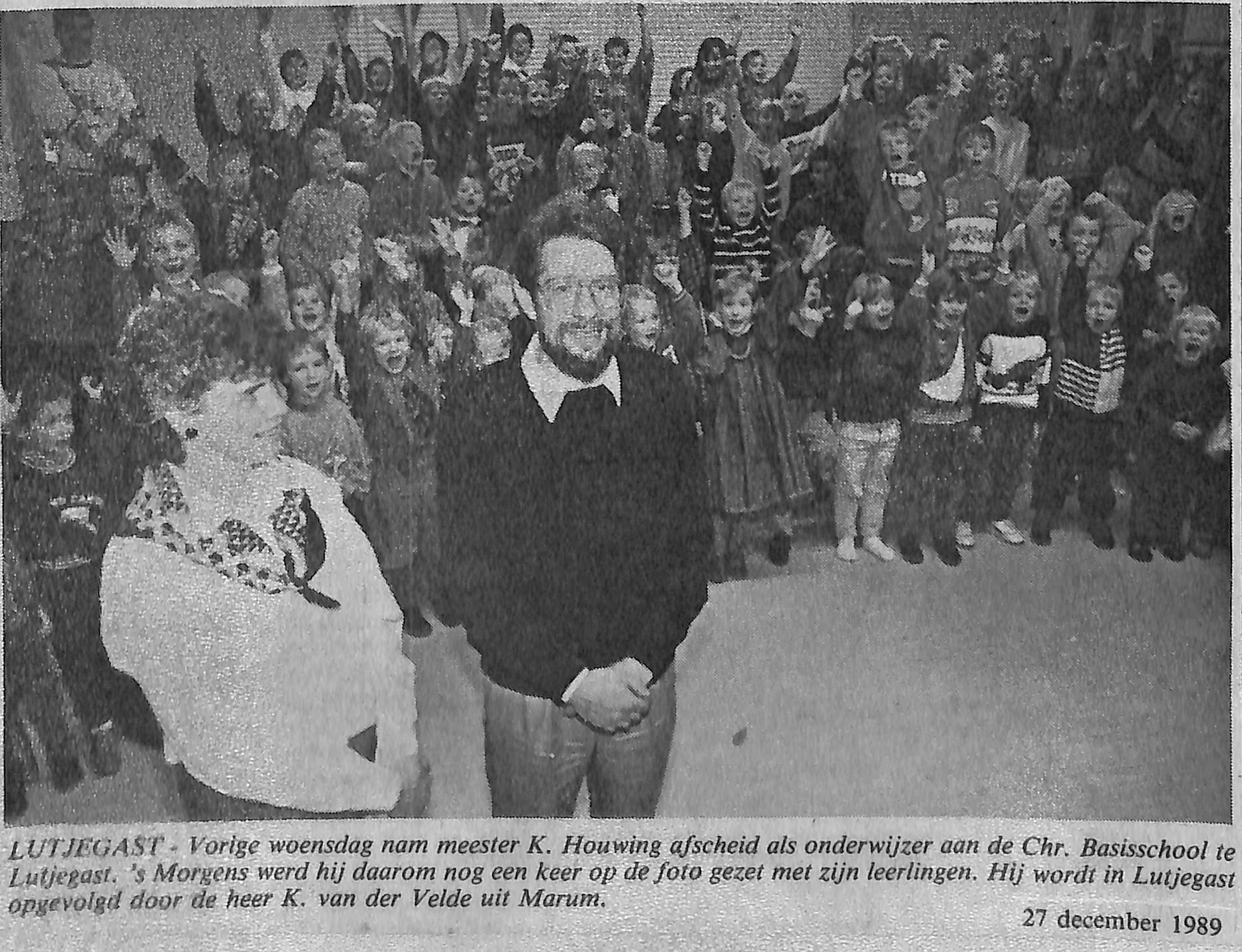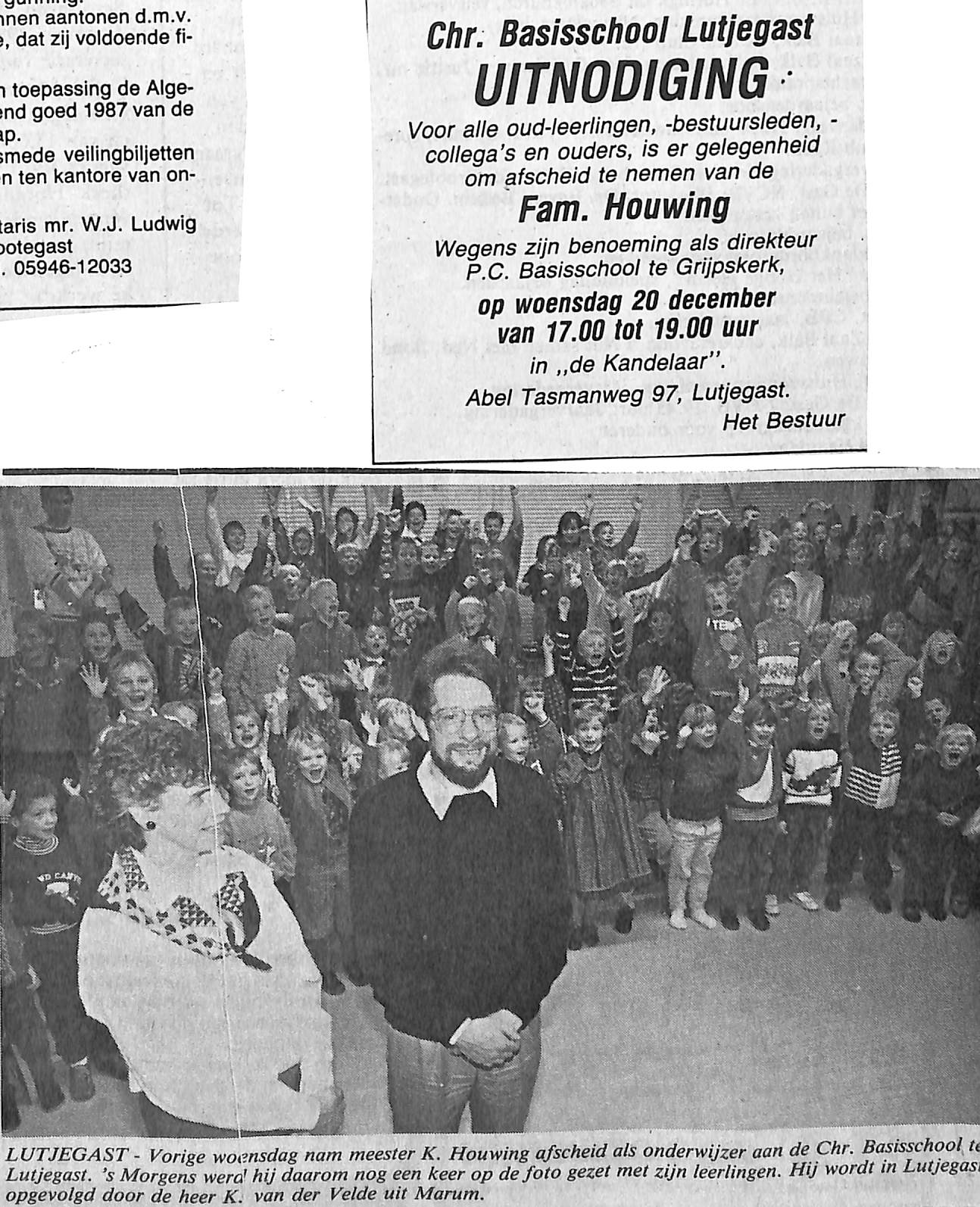 Tijdens de ledenvergadering van Prot. Chr. Basisonderwijs werden de notulen gelezen door mevr. G. v. Til- Zeldenrust, penningmeester Th. Zuidema had geen bijzonderheden. De verkoop/verhuur van de schoolwoning werd besproken omdat de nieuwe directeur J. Visser al over een eigen woning beschikte.Ook werd afscheid genomen van leraar K. Houwing en een nieuwe leerkracht benoemd dhr. K. van der Velde. Vanwege het 100-jarige bestaan werden er text en foto's verzameld door dhr. T. Stol uit Grootegast, de heeer en mevrouw Huizinga en dhr. G. Solle. Tijdens de bestuursverkiezing werd dhr. B. Henstra herkozen en als nieuw bestuurslid mevr. R. de Boer-Kazemier.