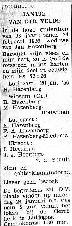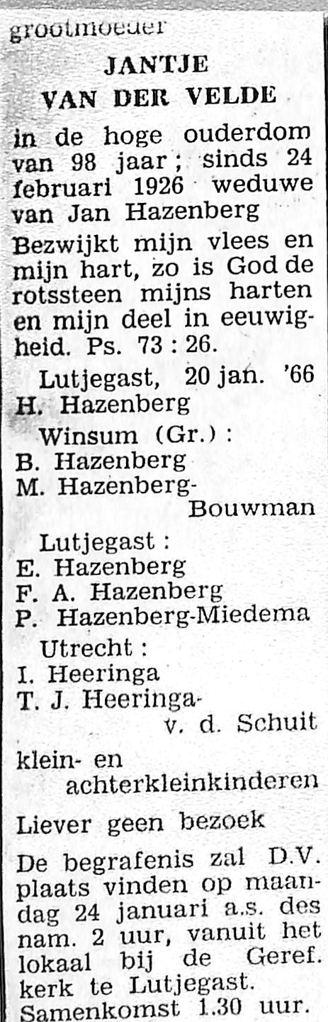 Jantje van der Velde, weduwe van Jan Hazenberg, overleden in de hoge ouderdom van 98 jaar