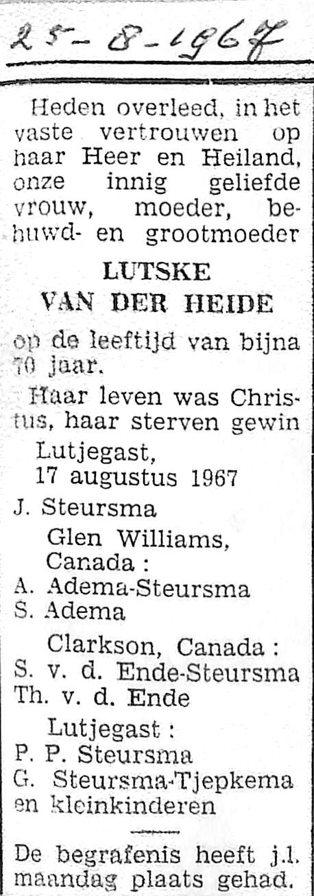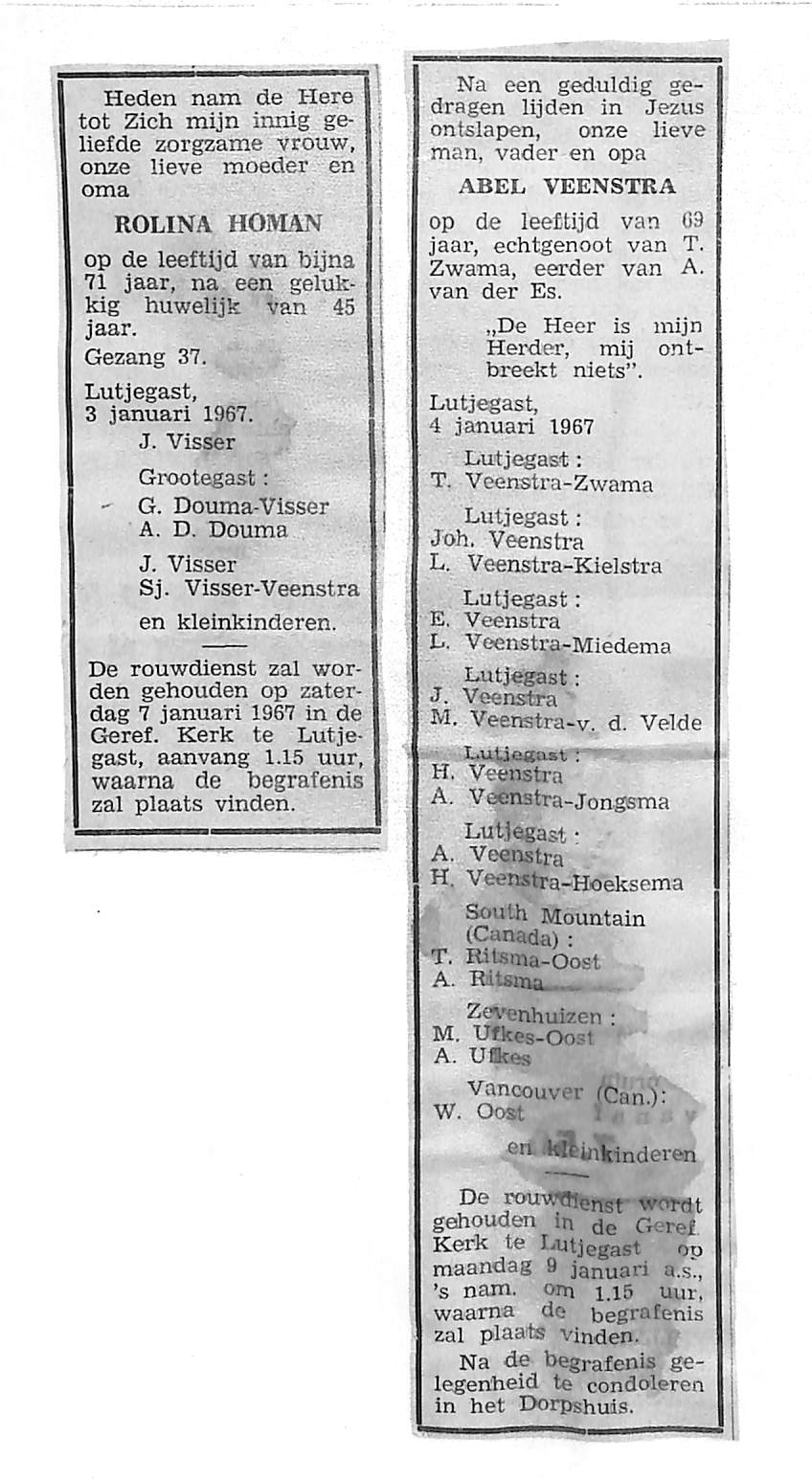 Overleden Rolina Homen, Visser, Douma, Veenstra