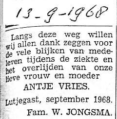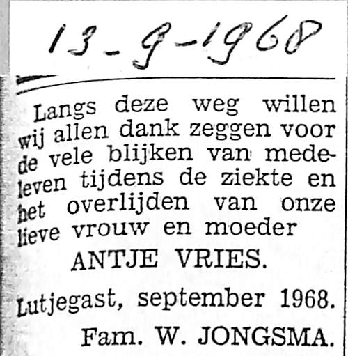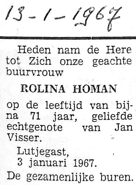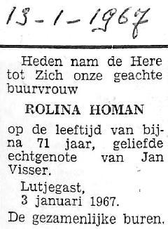 Rolina Homan, echtgenote van Jan Visser overleden op 3-1-1967