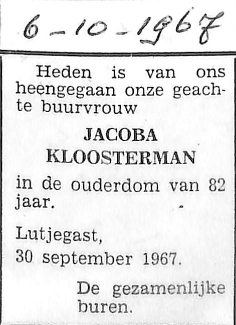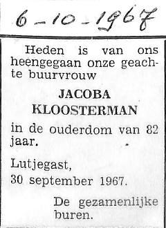 Jacoba Kloosterman, overleden 30 september 1967, 82 jaar