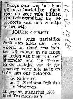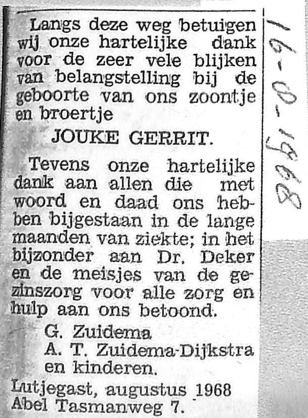 Dankbetuiging na periode van ziekte na de geboorte van Jouke Gerrit