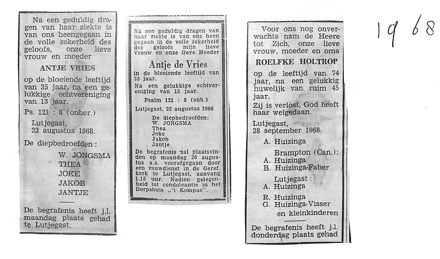 Overleden Roelfke Holtrop, Huizinga,Faber,Visser
