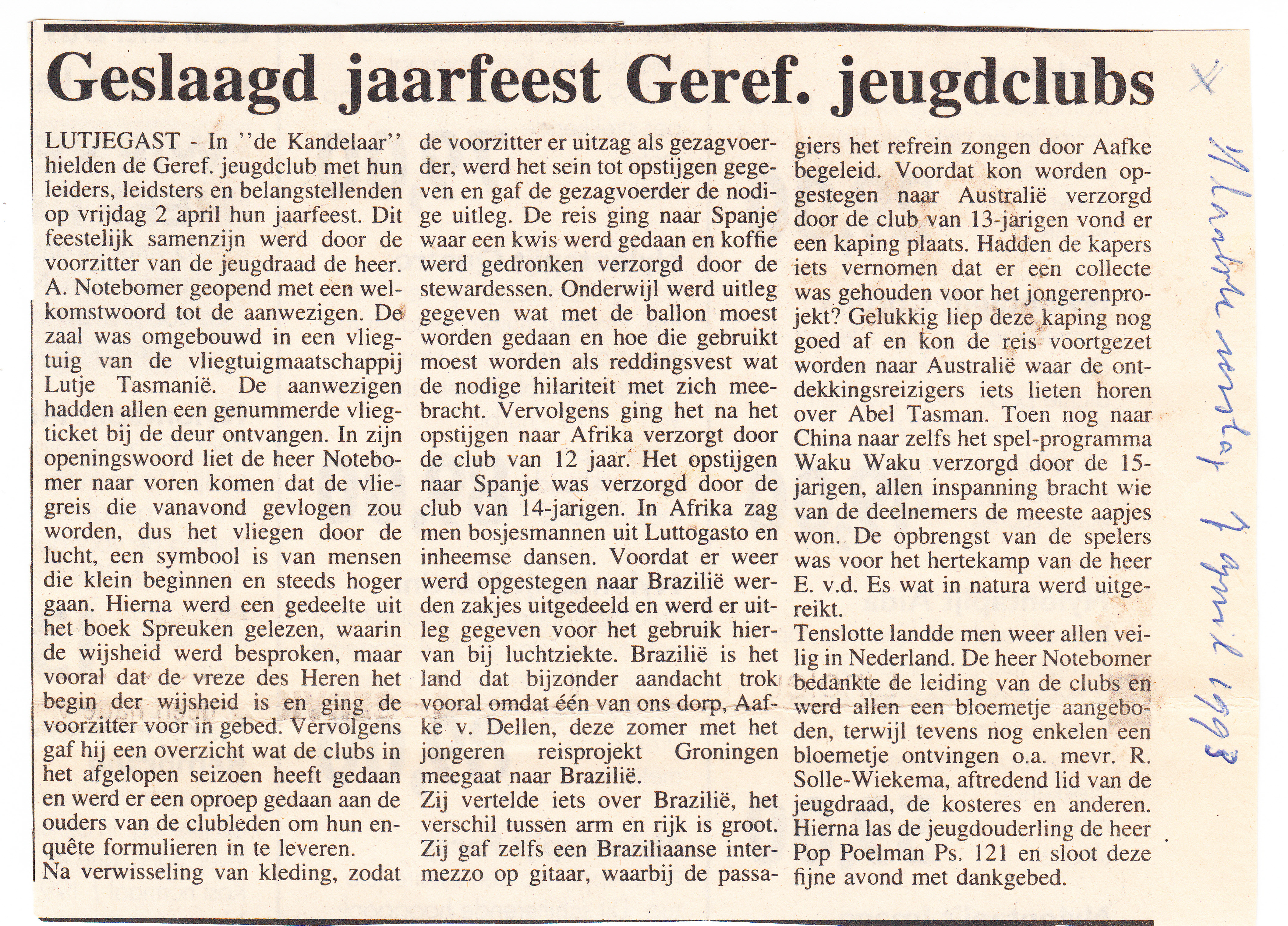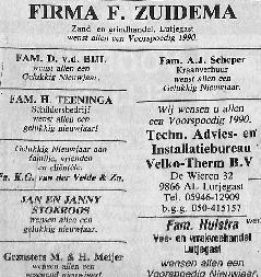 nieuwjaarswensen van; firma F. Zuidema, D. v/d Bijl, H. Teeninga, firma K. G. v/d Velde, Jan en Janny Stokroos, dames Meijer, A. J. Scheper, techn. advies- en installatiebureau Velko-Therm B. V., Huistra