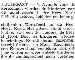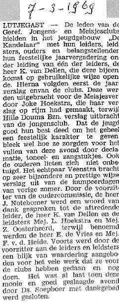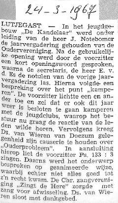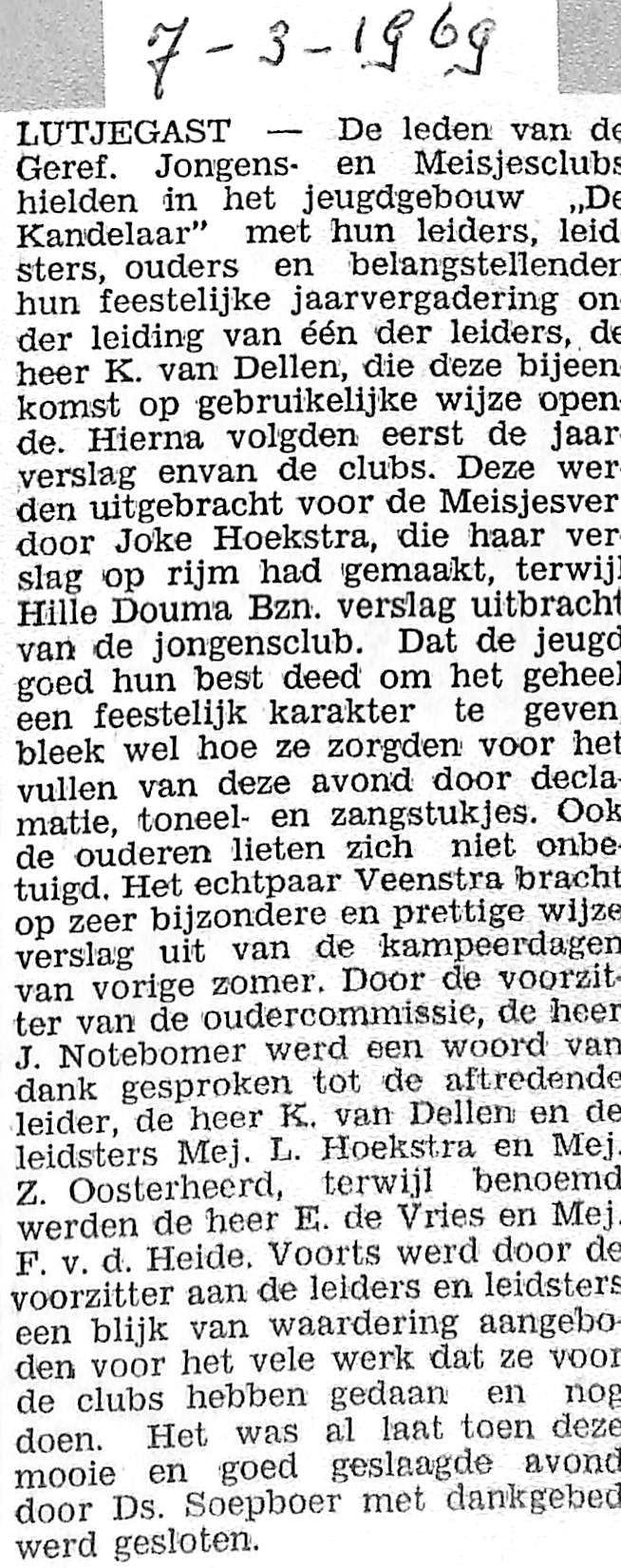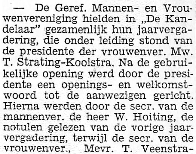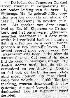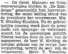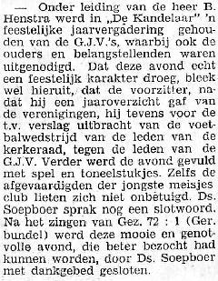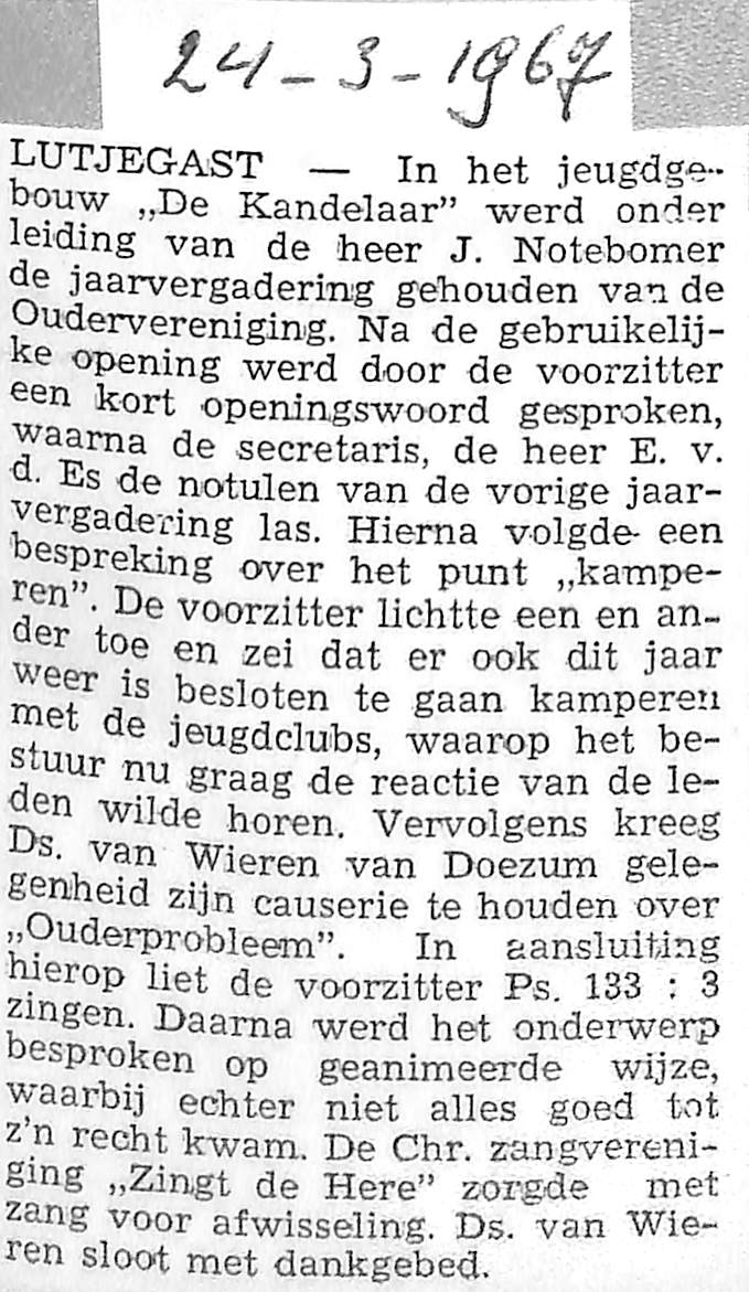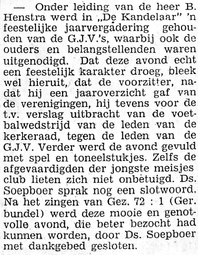 Jaarvergadering in de Kandelaar. Jeugd gaat komend jaar weer kamperen. Ds. van Wieren spreekt over "ouderprobleem". Zangvereniging treed op.