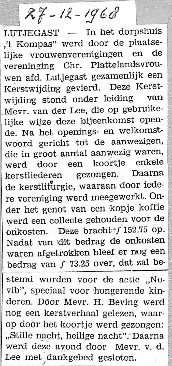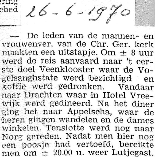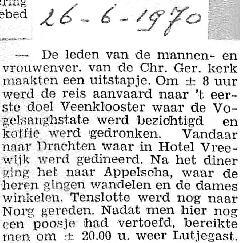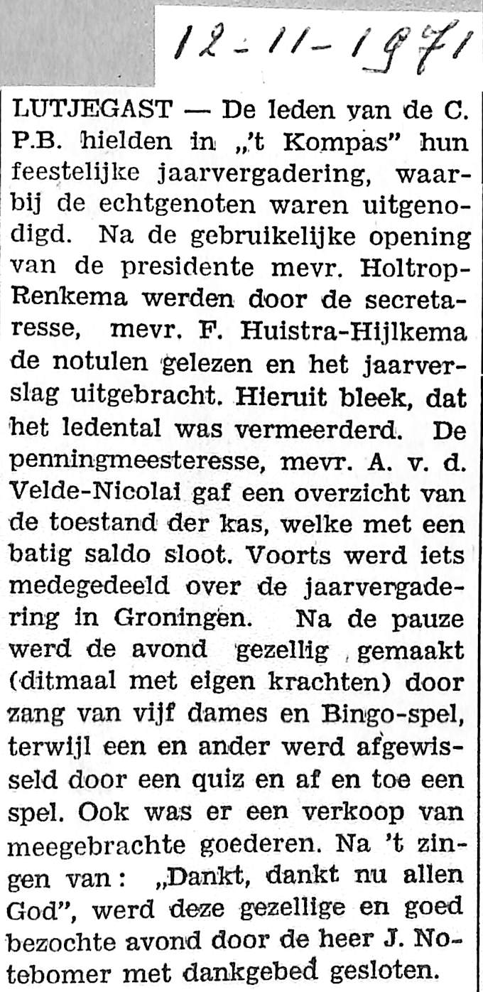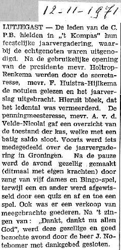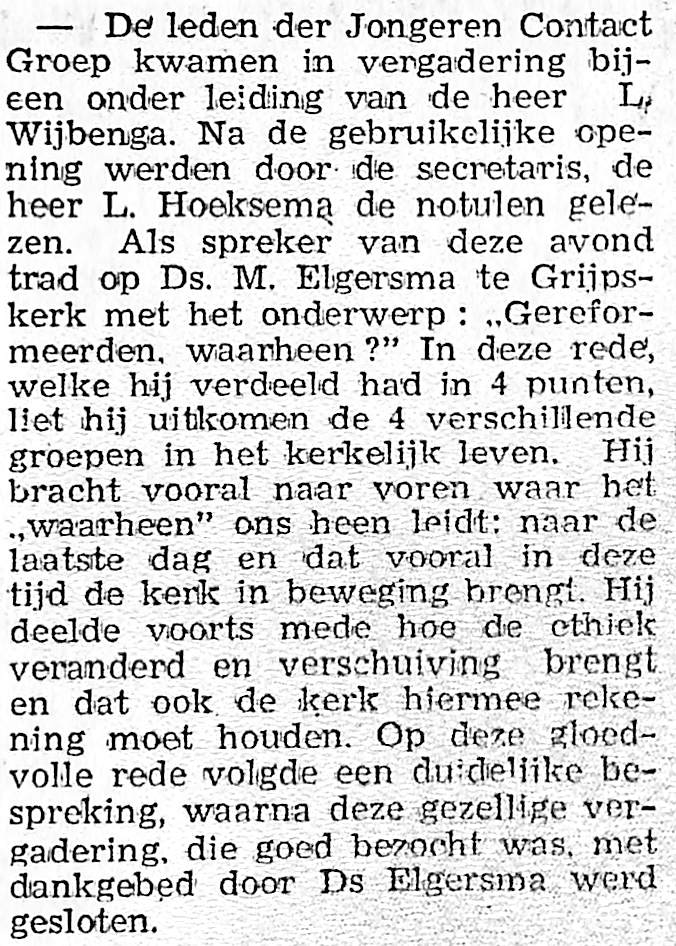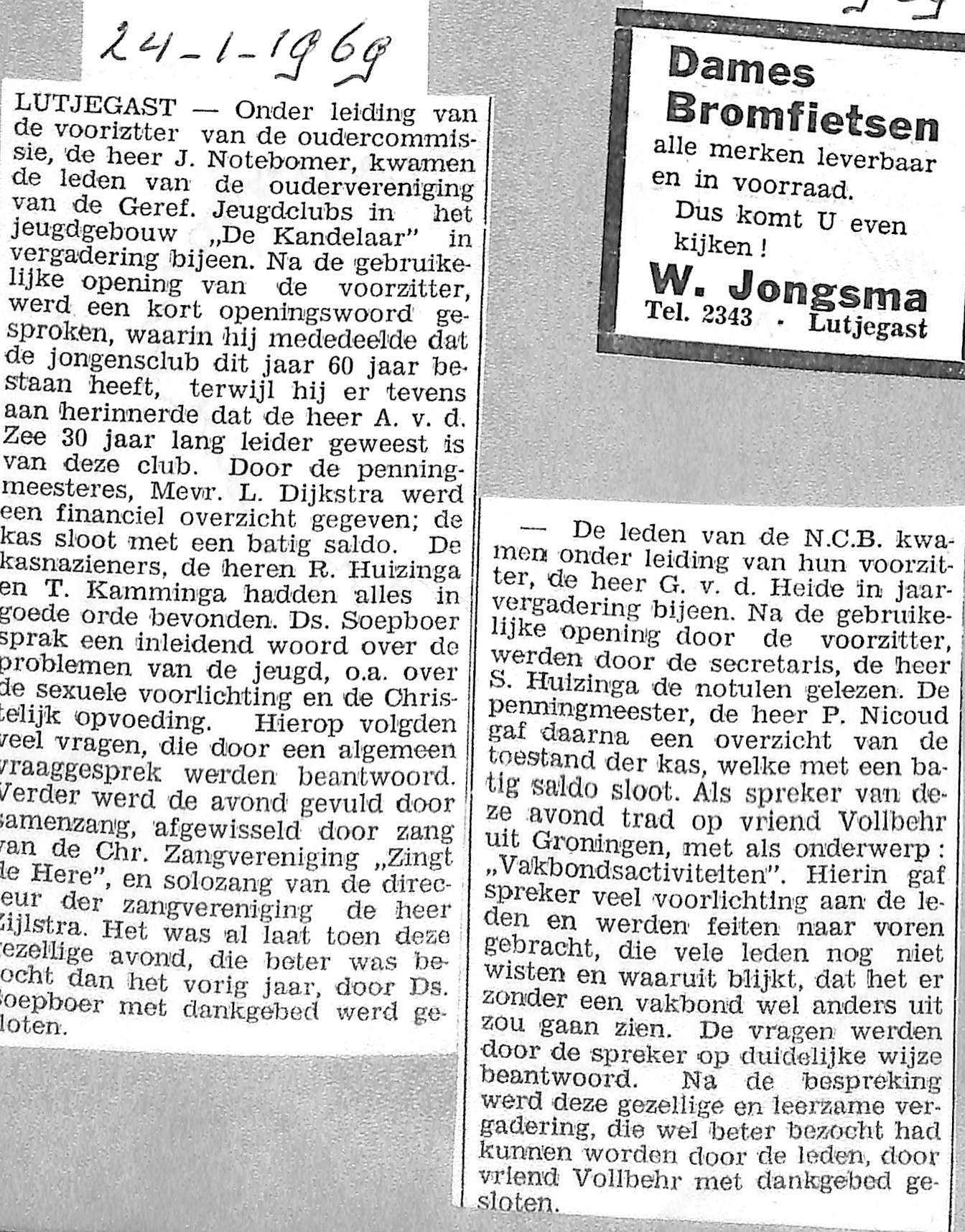 Jaarvergadering in de Kandelaar. Jeugd gaat komend jaar weer kamperen. Ds. van Wieren spreekt over "ouderprobleem". Zangvereniging treed op.