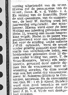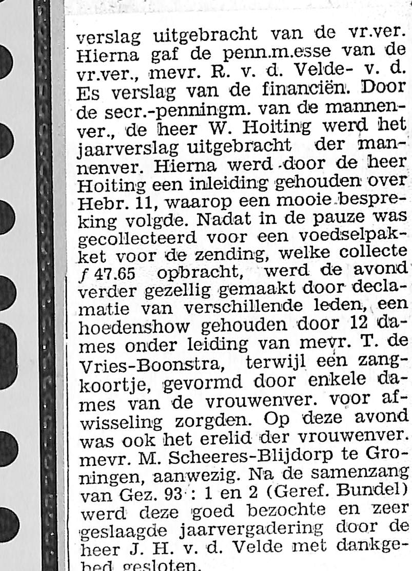Notulen, jaarverslagen, financiële verslagen, inleiding n.a.v. Hebr. 11, collecte voedselpakketten voor de zending, declamaties, hoedenshow, zang