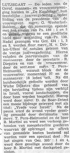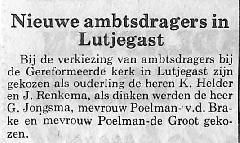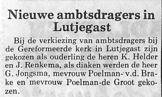 K. Helder en J. Renkema, ouderling Geref Kerk, G, Jongsma, Mevr. Poelman - v.d. Brake, mevr. Poelman - de Groot diaken.