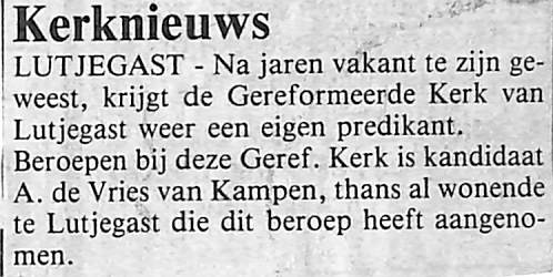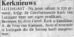 A. de Vries van Kampen, nieuwe ds in Geref kerk
