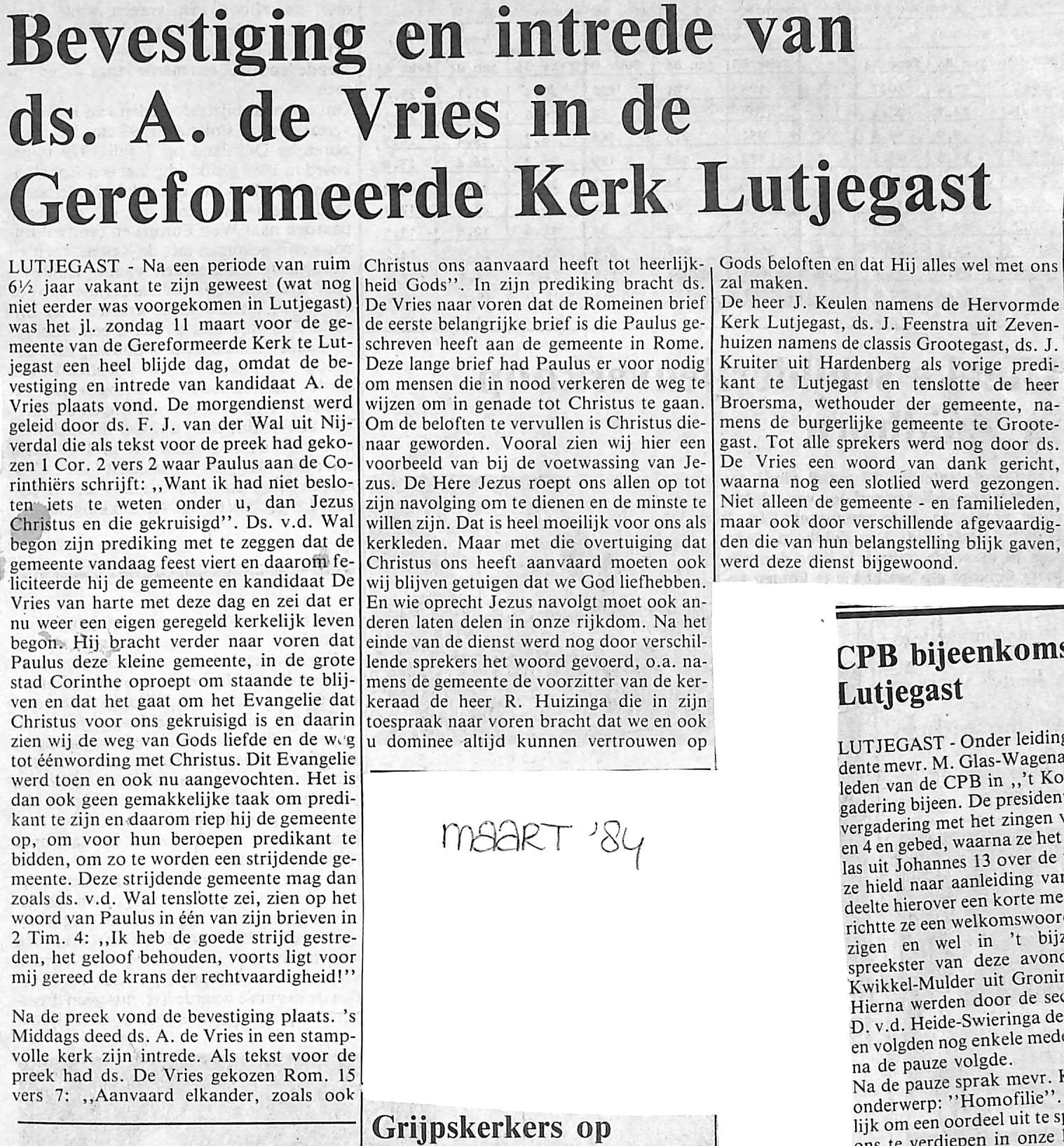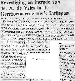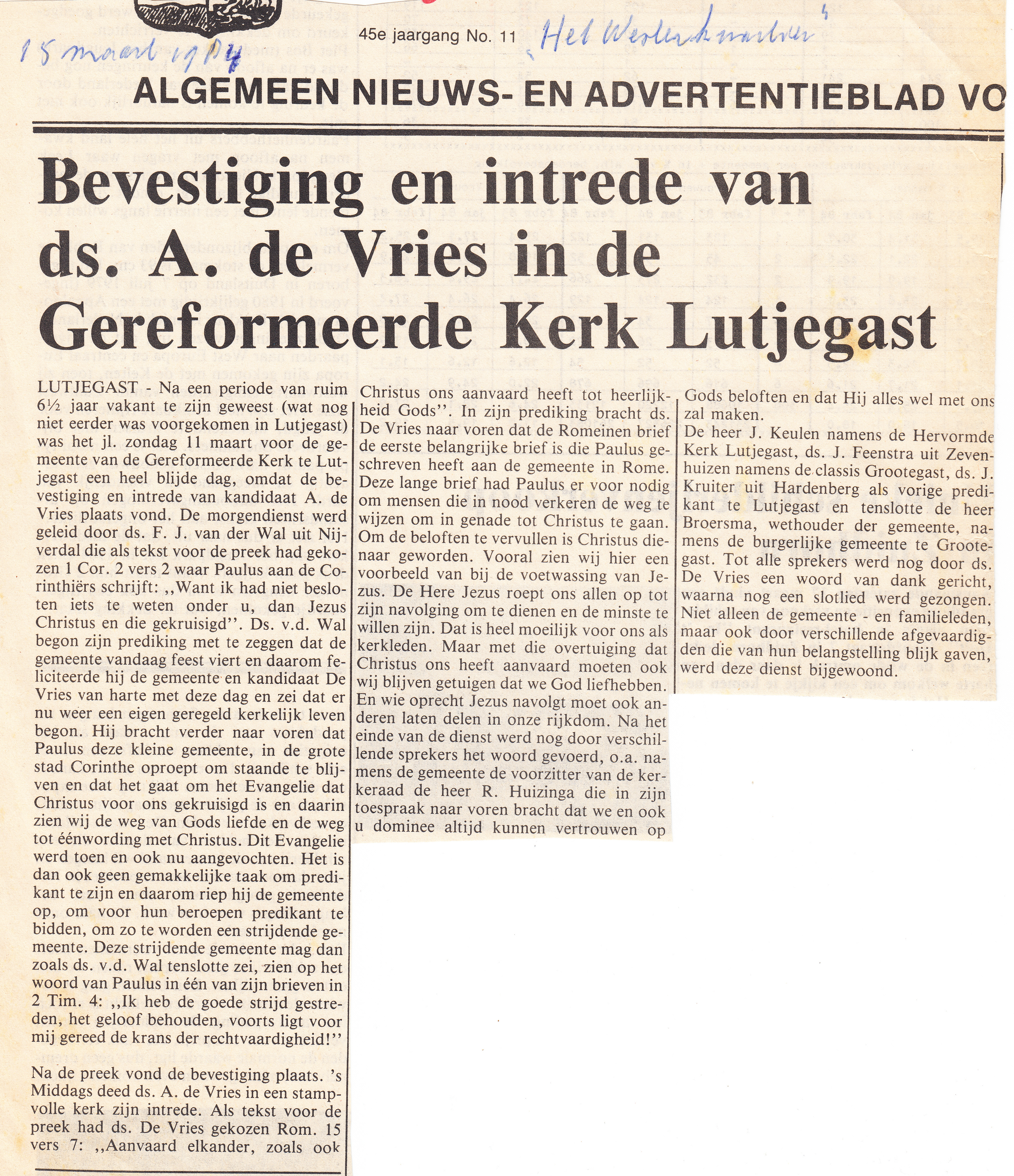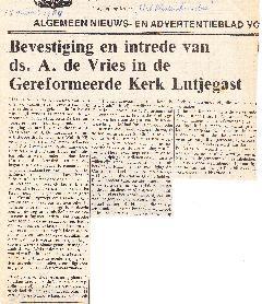 Intrede ds. A. de Vries, in de gereformeerde kerk Lutjegast.