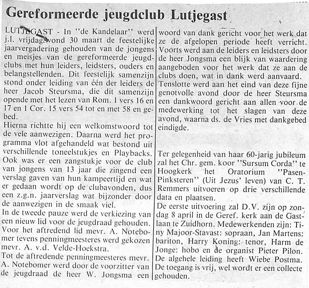 feestelijke jaarvergadering jeugdclub; Jacob Steursma, A. Notebomer, A. v/d Velde-Hoekstra, W. Jongsma,