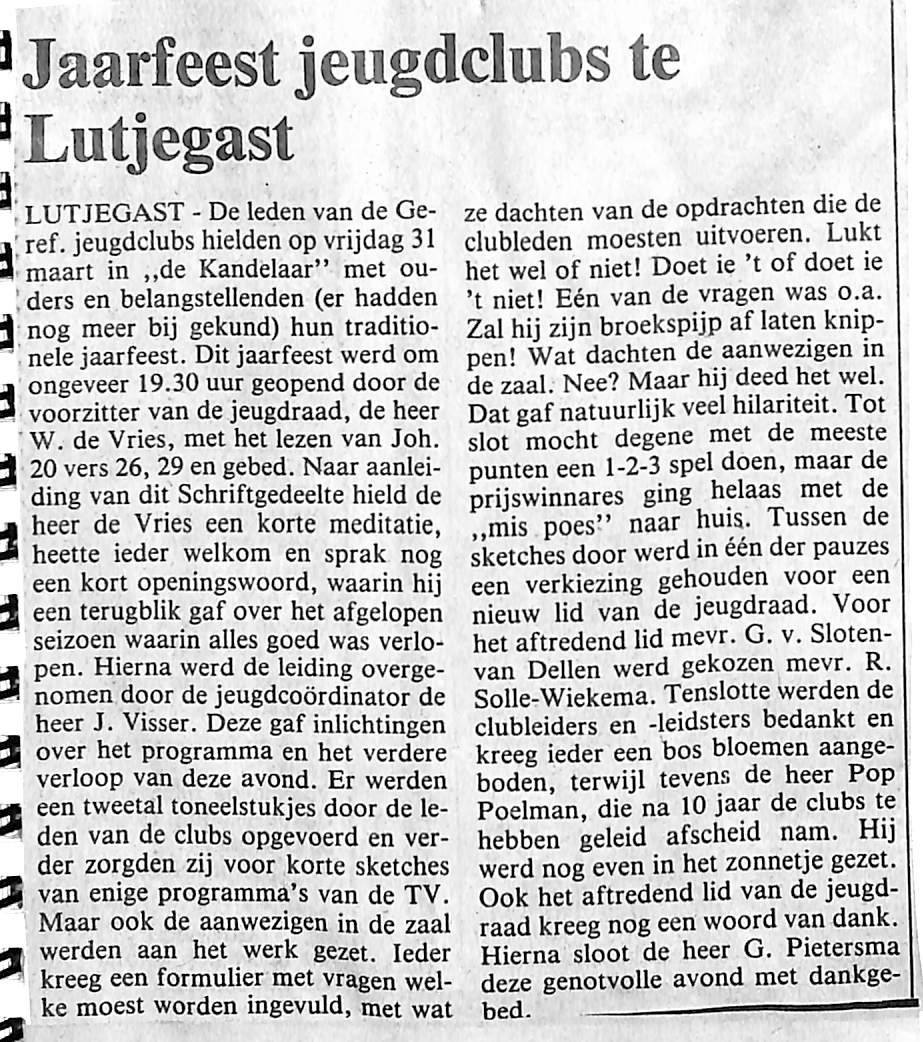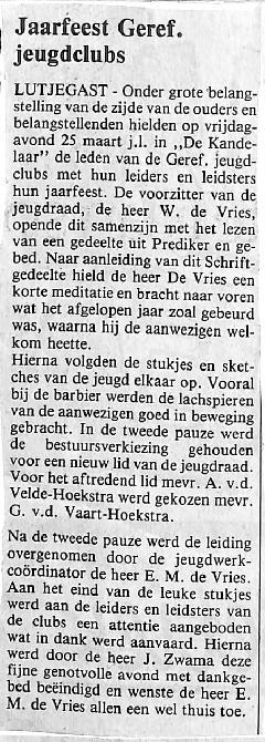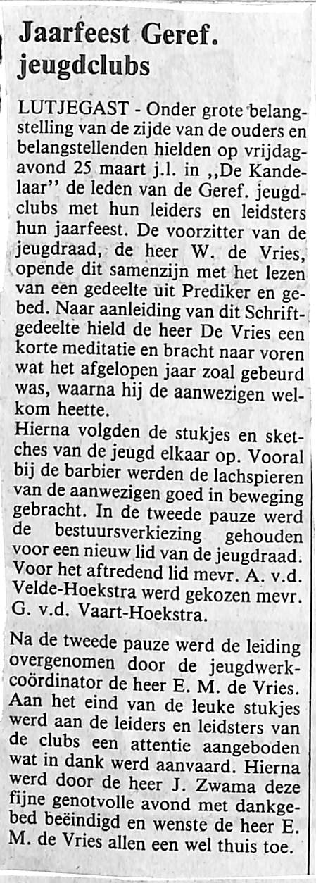 Bij het jaarfeest op 25 maart j.l.werd de bestuursverkiezing gehouden voor een nieuw lid van de jeugdraad.Aftredend lid A. v.d. Velde-Hoekstra werd vervangen door G. van de Vaart-Hoekstra. Avond werd geeindigd door J. Zwama en E.M. de Vries wenste iedereen wel thuis.