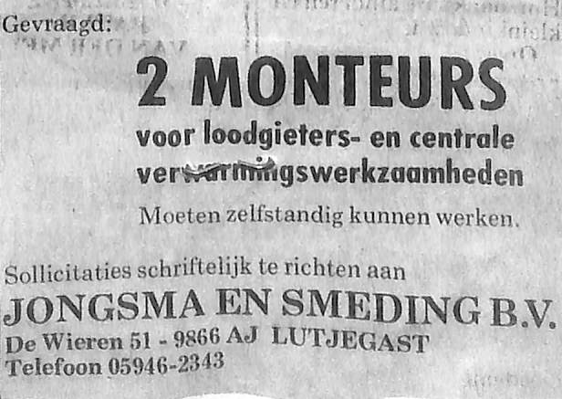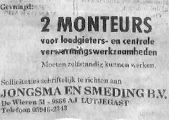 2 monteurs gevraagd; Jongsma en Smeding B.V