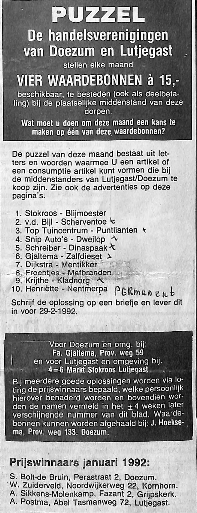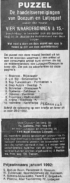puzzel van de maand, bedrijven Stokroos, v.d. Bijl, Top, Snip, Schreiber, Gjaltema, Dijkstra, Froentjes, Krijthe, Henriette en winnaars jan. 1992 S.Bolt-de Bruin Doezum, W. Zuiderveld Kornhorn, A.Sikkens-Molenkamp Grijpskerk, A. Postma Lutjegast