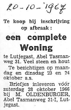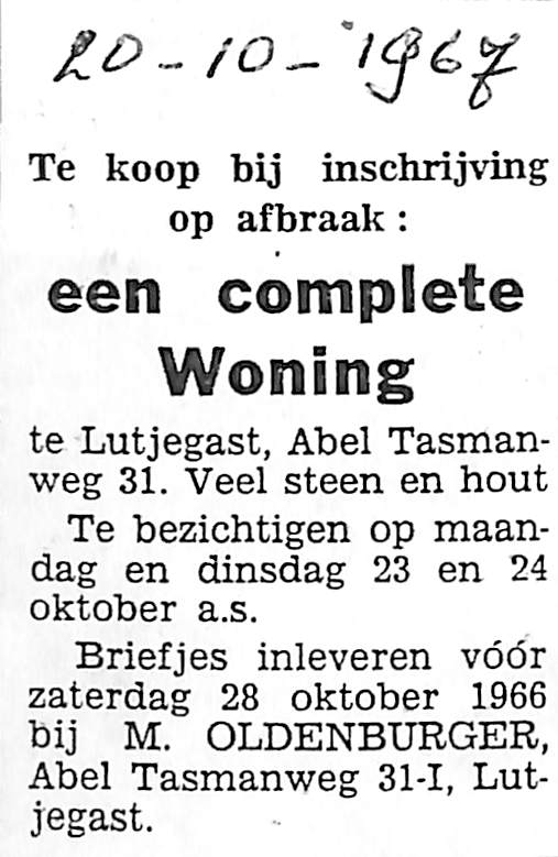 Te koop bij inschrijving op afbraak: Abel Tasmanweg 31. Briefjes inleveren bij M. Oldenburger, Abel Tasmanweg 31-I