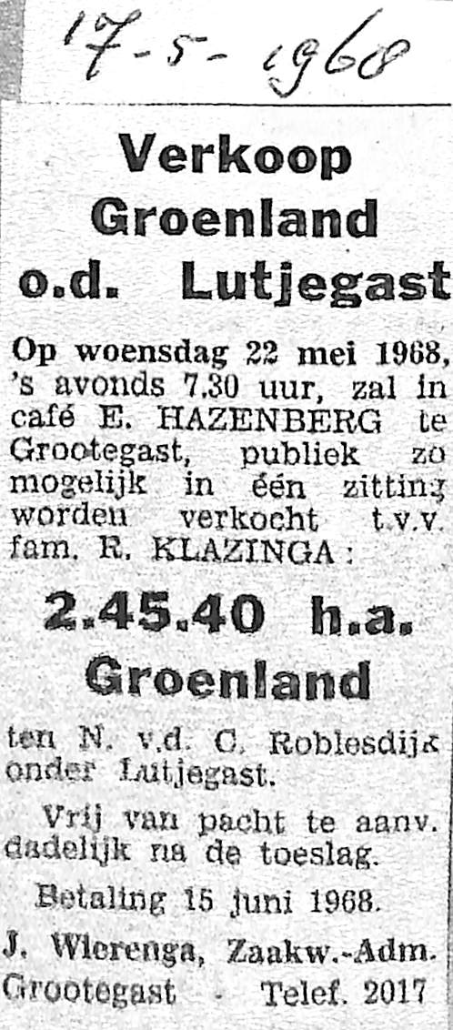 Zaakwaarnemer J. Wierenga kondigt veiling aan op 22 mei van 2.45.40 ha land ten noorden van de Caspar Roblesdijk