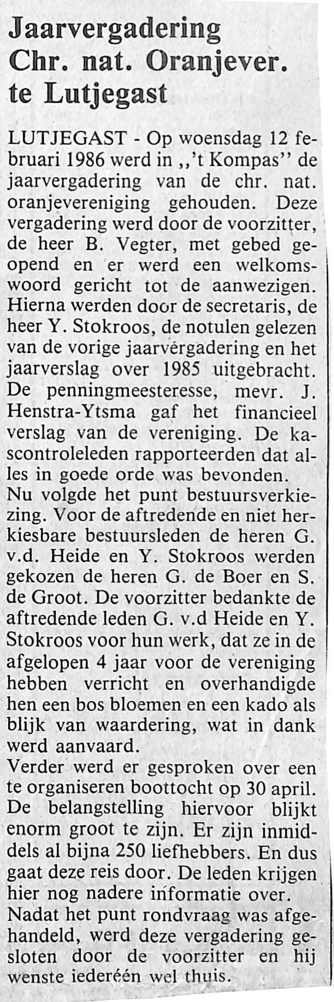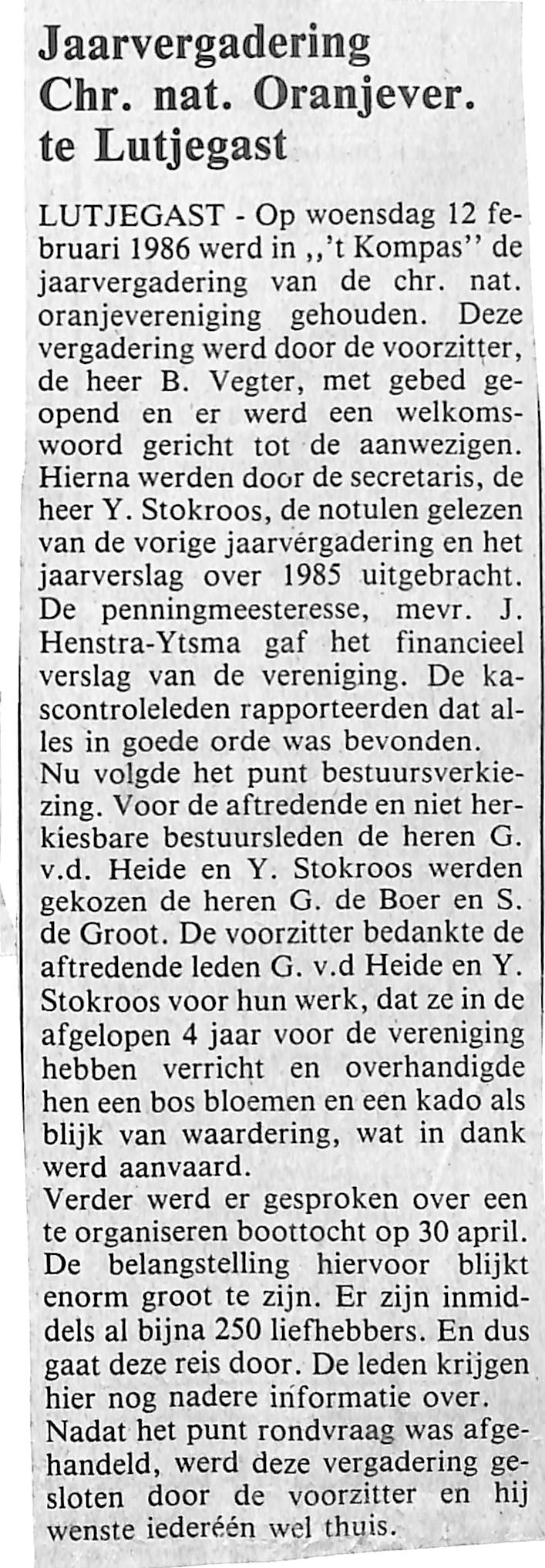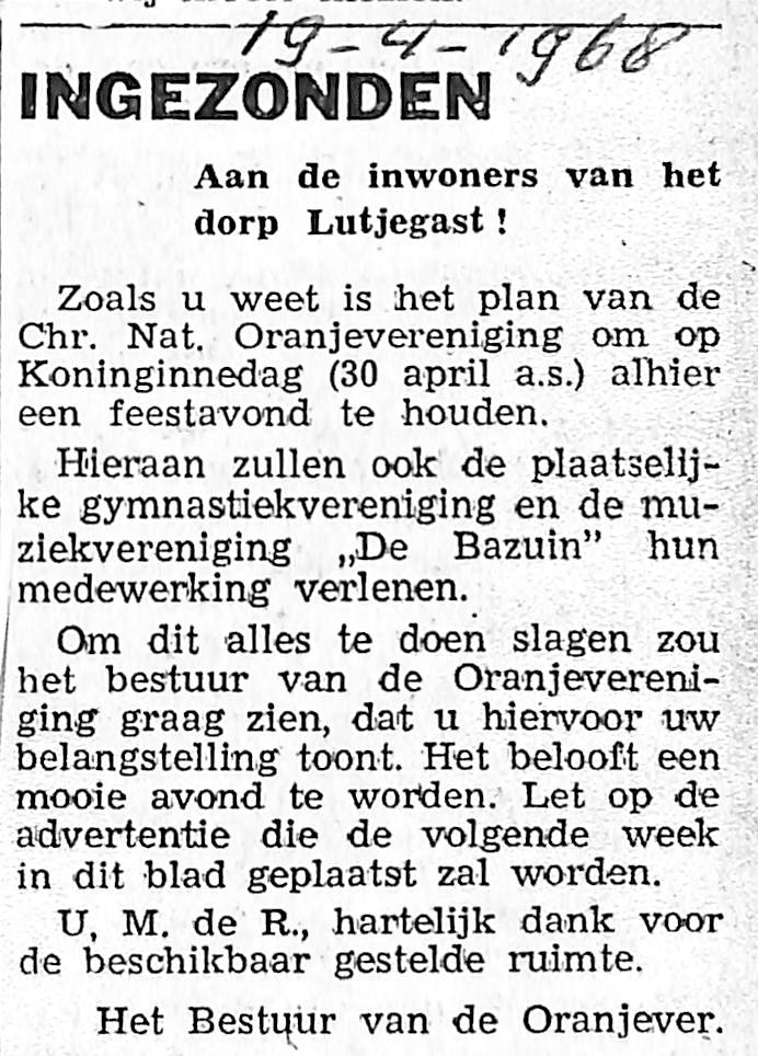 Chr. Nationale Oranjevereniging kondigt feestavond aan met Koninginnedag 30 april, mmv De Bazuin en de Gymnastiekvereniging, advertentie volgt