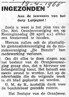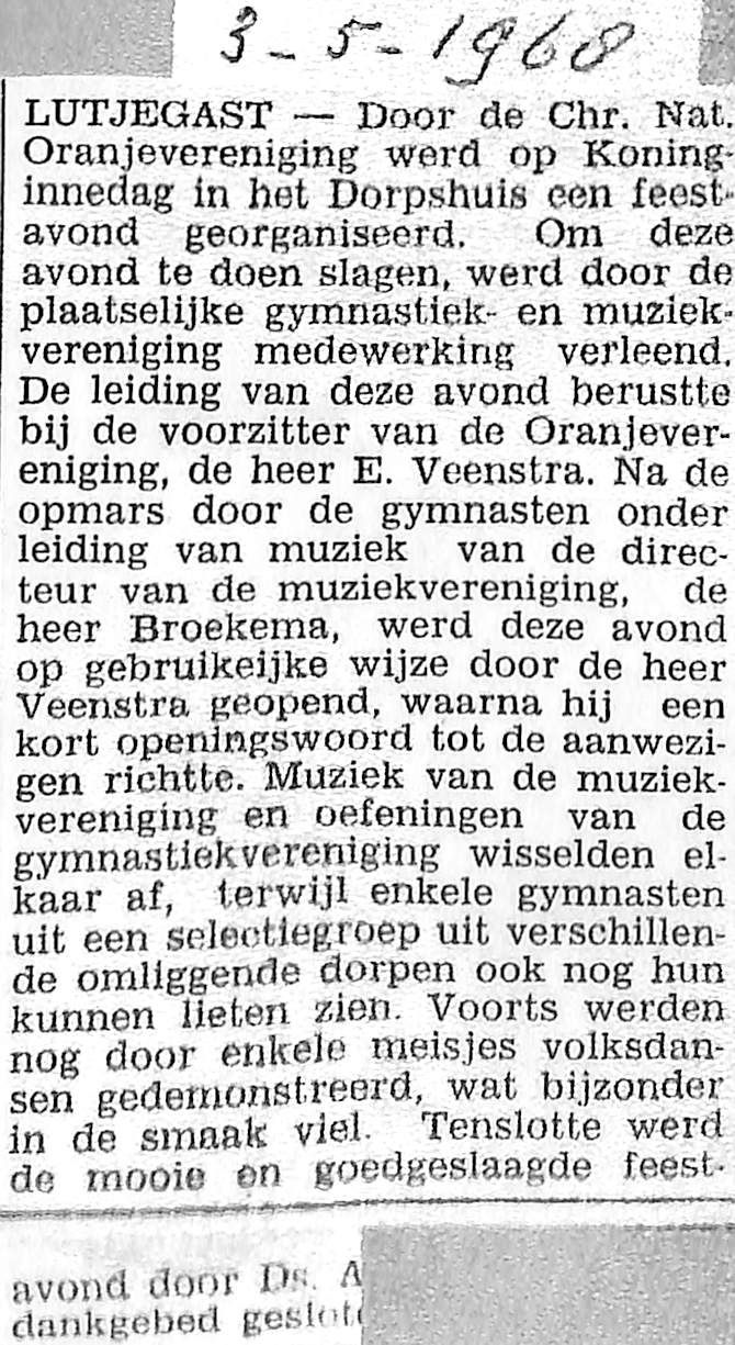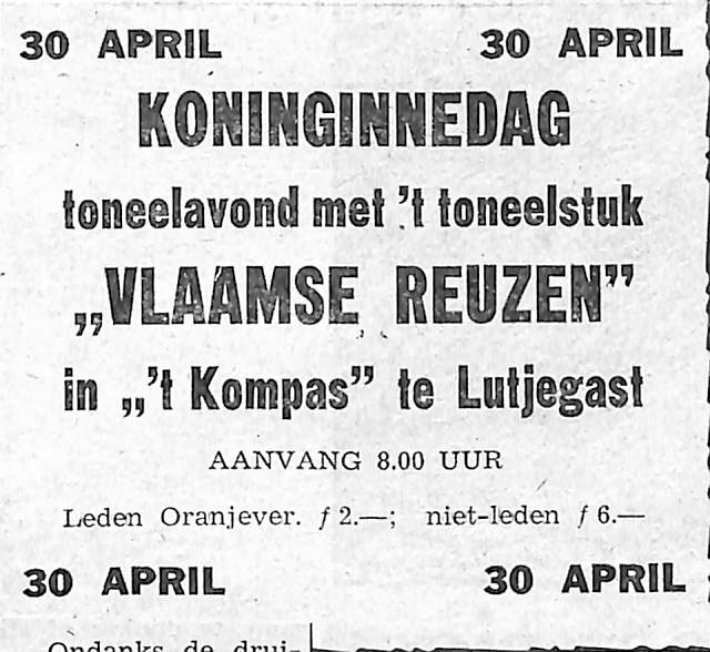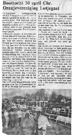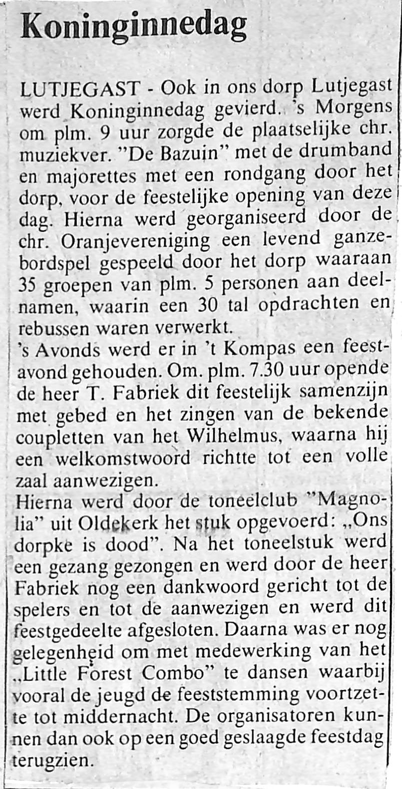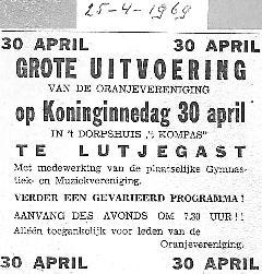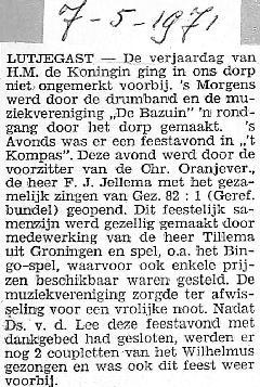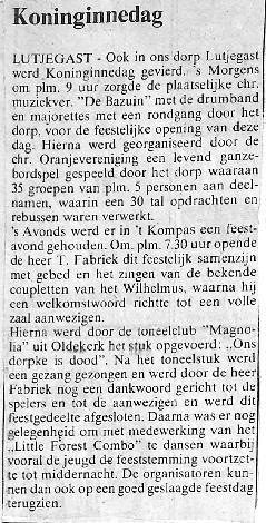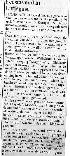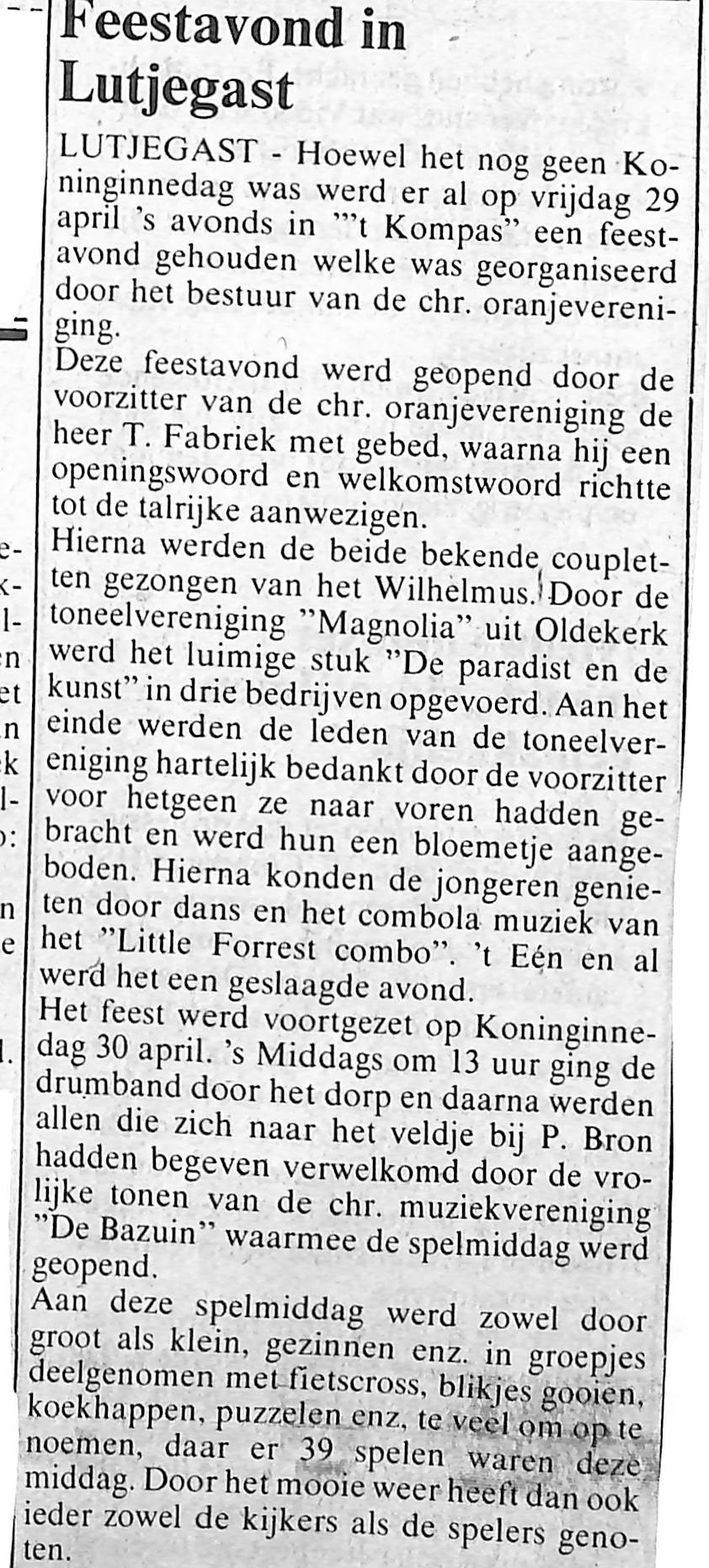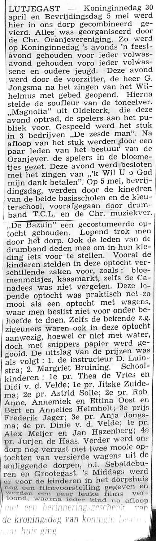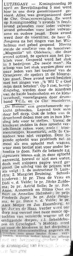 Chr. Nat. Oranjevereniging viert Koninginnedag. De Bazuin gaat rond door het dorp en speelt op plein voor Geref. Kerk. Toneelavond. Chr. Toneelver. "Unitas" uit Hoogkerk speelt blijspel in 4 bedrijven genaamd "De onbekende wereld", afgewisseld door orgelspel