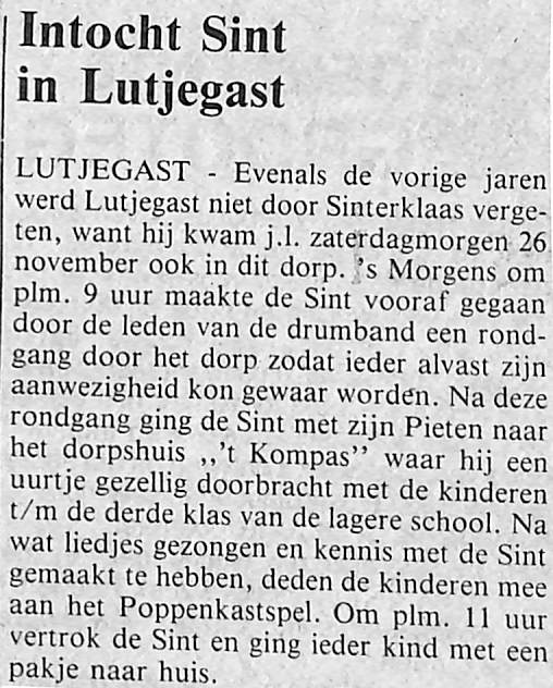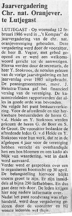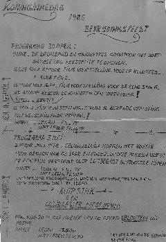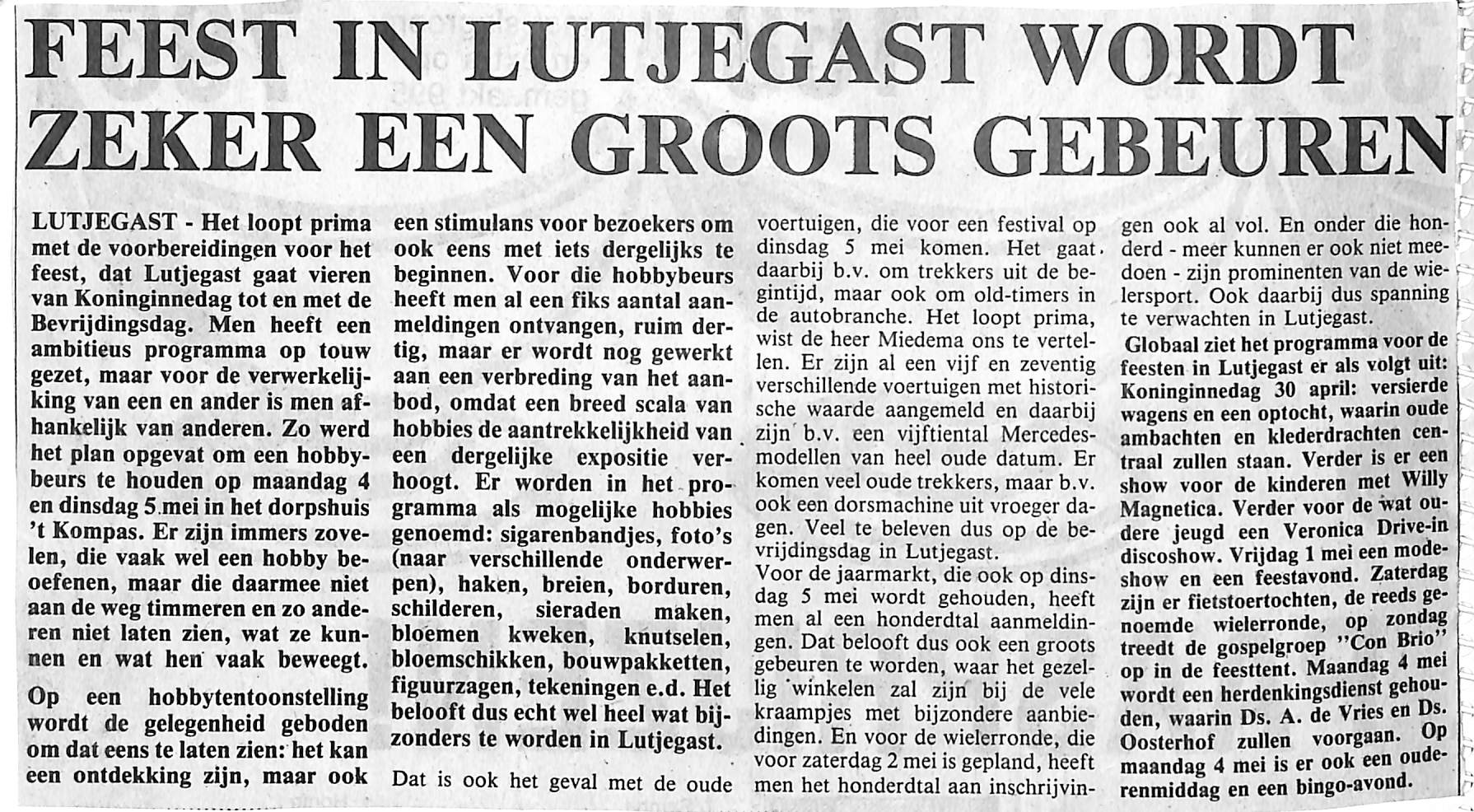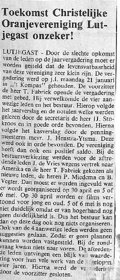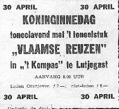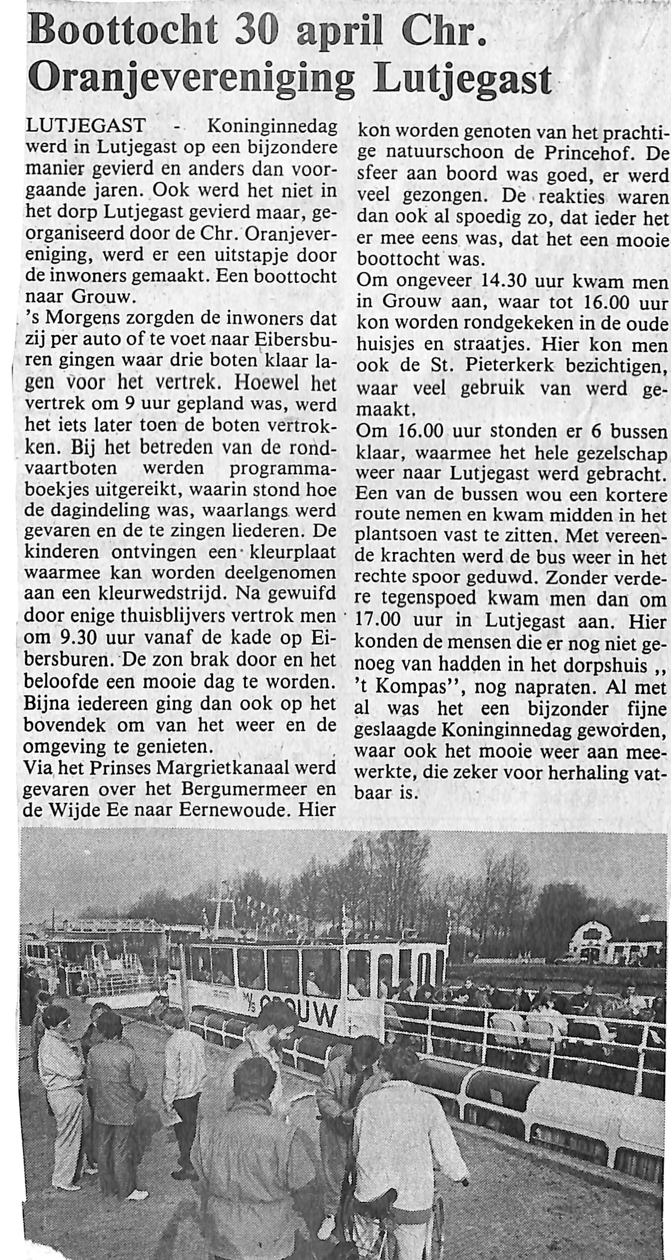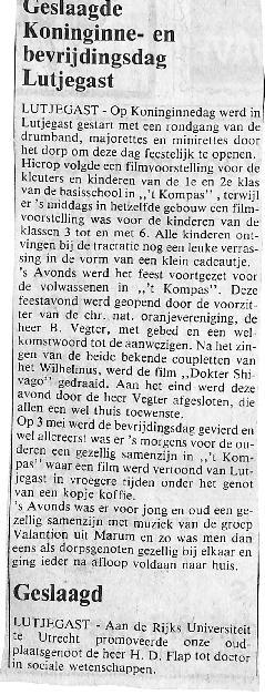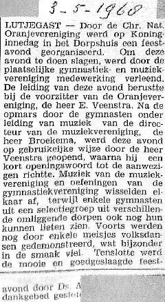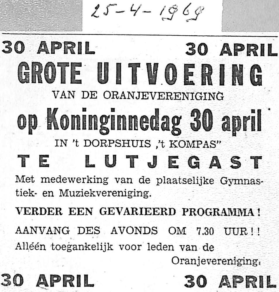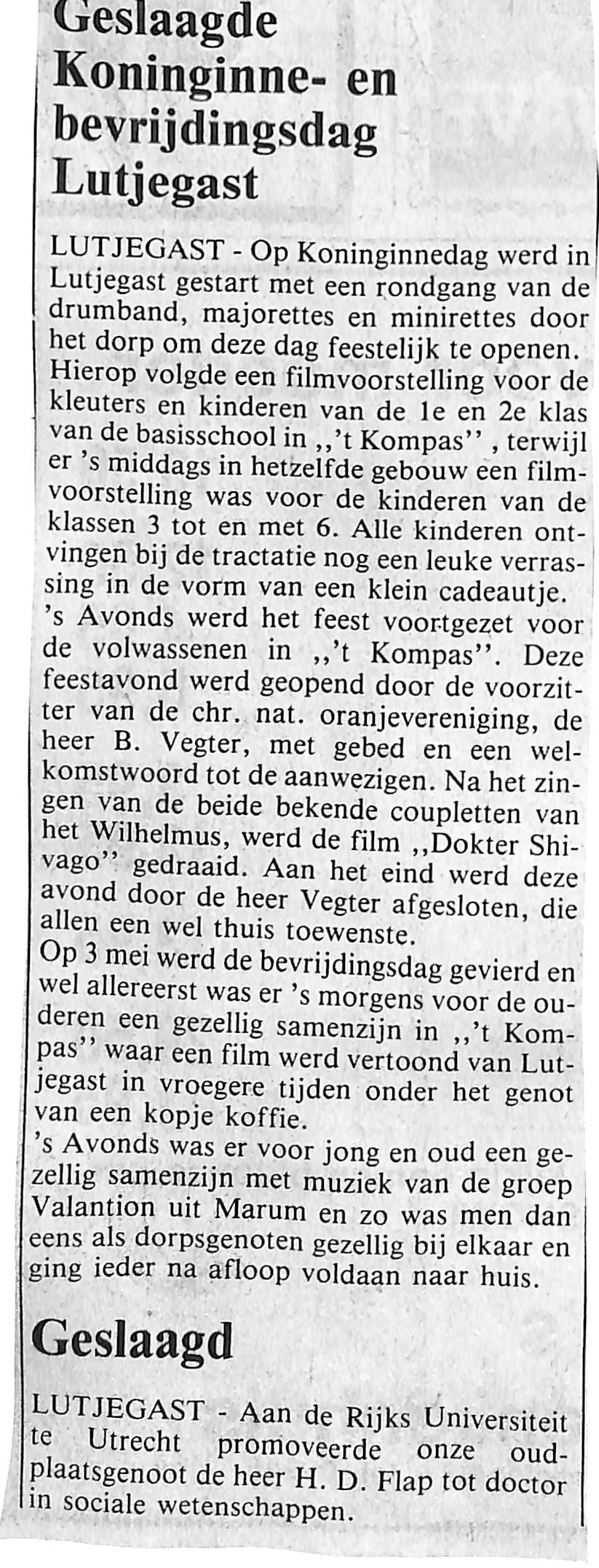 Chr. Nat. Oranjevereniging viert Koninginnedag. De Bazuin gaat rond door het dorp en speelt op plein voor Geref. Kerk. Toneelavond. Chr. Toneelver. "Unitas" uit Hoogkerk speelt blijspel in 4 bedrijven genaamd "De onbekende wereld", afgewisseld door orgelspel