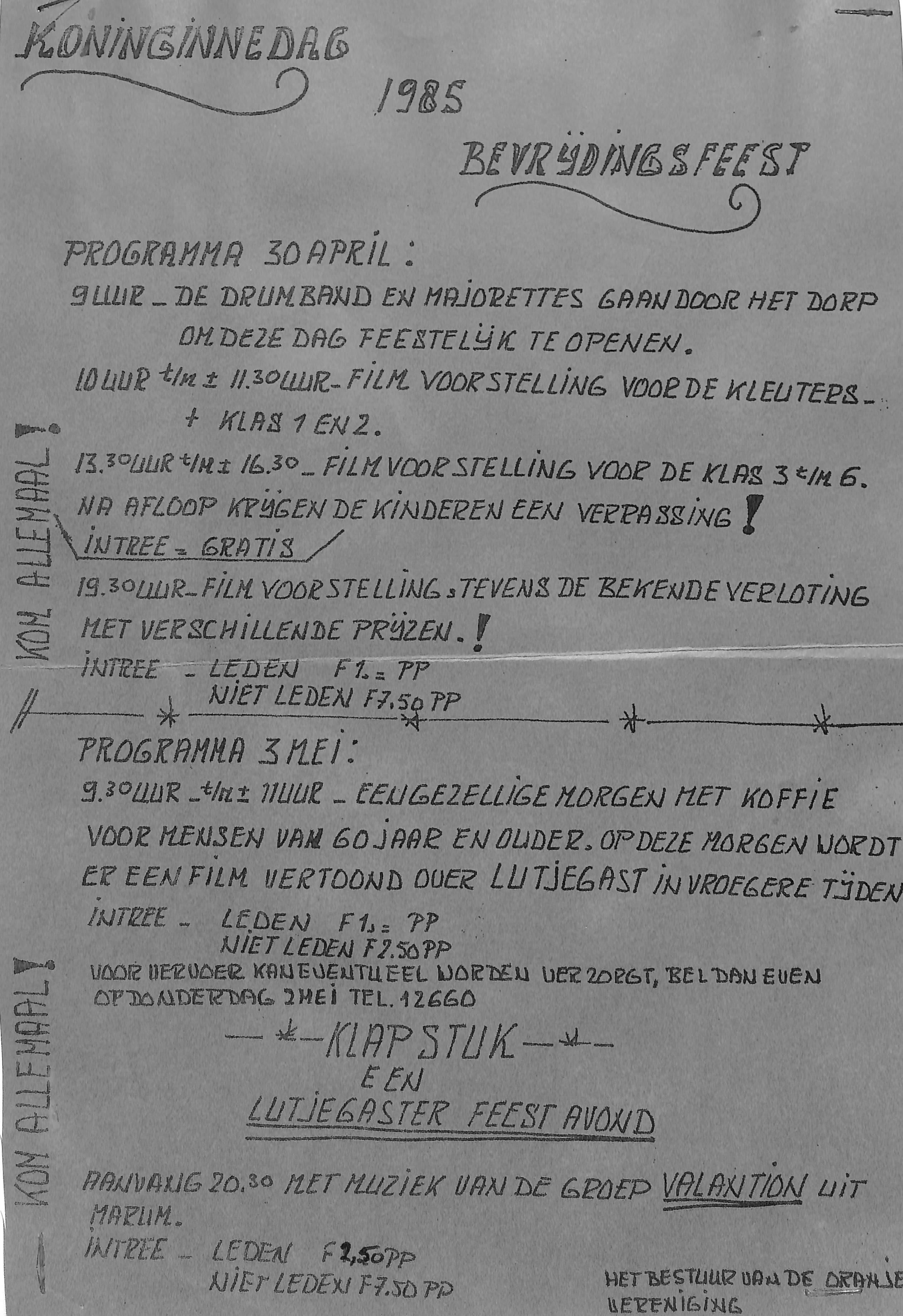 Oranjever., feestavond op vrijdag, zaterdag spelen voor de kinderen, fietscross enz
