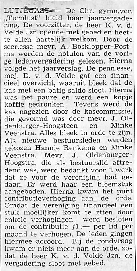 gymvereniging ,,Turnlust" hield een jaarvergadering; K. v/d Velde, A. Bosklopper-Postma, D v/d Velde, J. Oldenburger-Hoogsteen, Mineke Veenstra, Hannie Renkema, J. Oldenburger-Hoogstra,