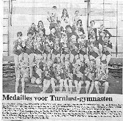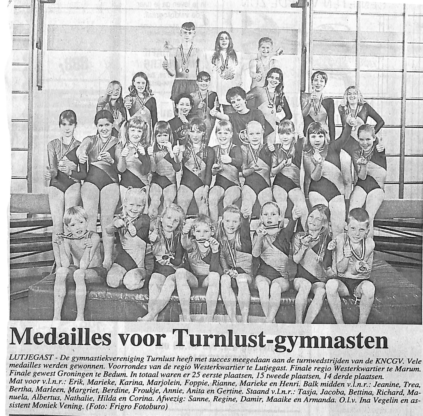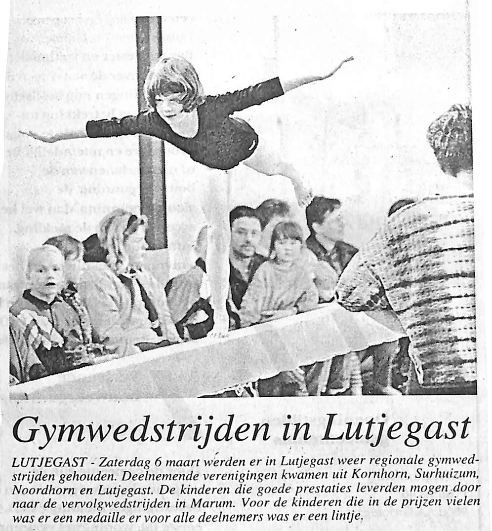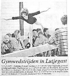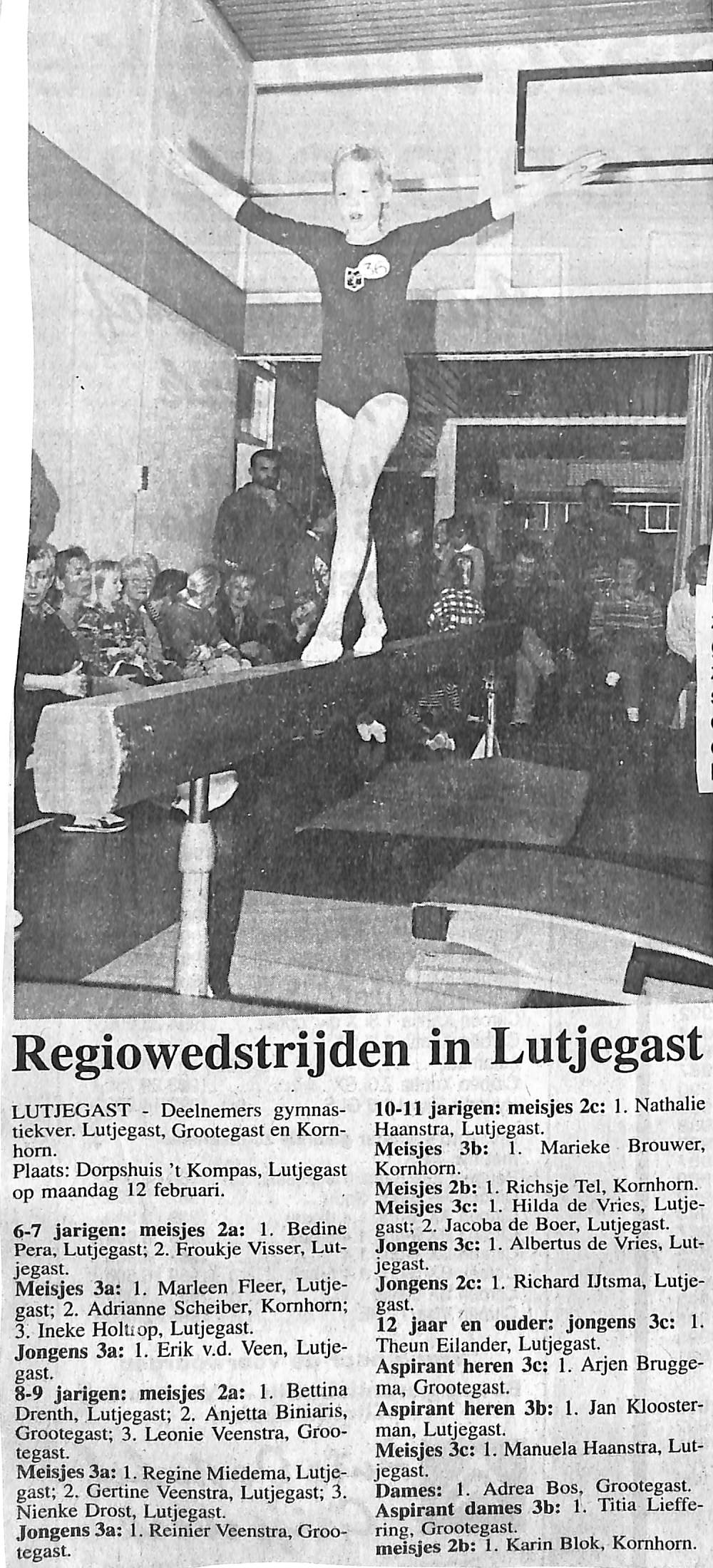 uitslag gymnastiekwedstrijd; Bedine Pera, Froukje Visser, Marleen Fleer, Adrianne Scheiber, Ineke Holtrop, Erik v/d Veen, Bettina Drenth, Anjetta Binjaris, Leonie Veenstra, Regine Miedema, Gertine Veenstra, Nienke Drost, Reinier Veenstra, Nathalie Haanstra, Marieke Brouwer, Richsje Tel, Hilda de Vries, Jacoba de Boer, Albertus de Vries, Richard IJtsma, Theun Eilander, Arjen Bruggema, Jan Kloosterman, Manuela Haanstra, Adrea Bos, Titia Lieffering, Karin Blok