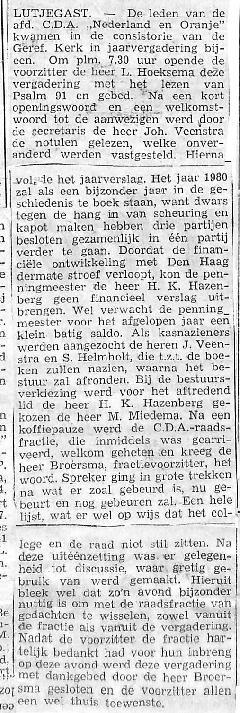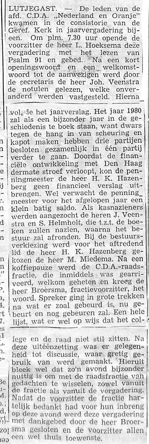 de leden van de afdeling C.D.A. ,,Nederland en Oranje" kwamen in een jaarvergadering bijeen; L. Hoeksma, Veenstra, H.K. Hazenberg, S. Helmont, M. Miedema, Boersma,