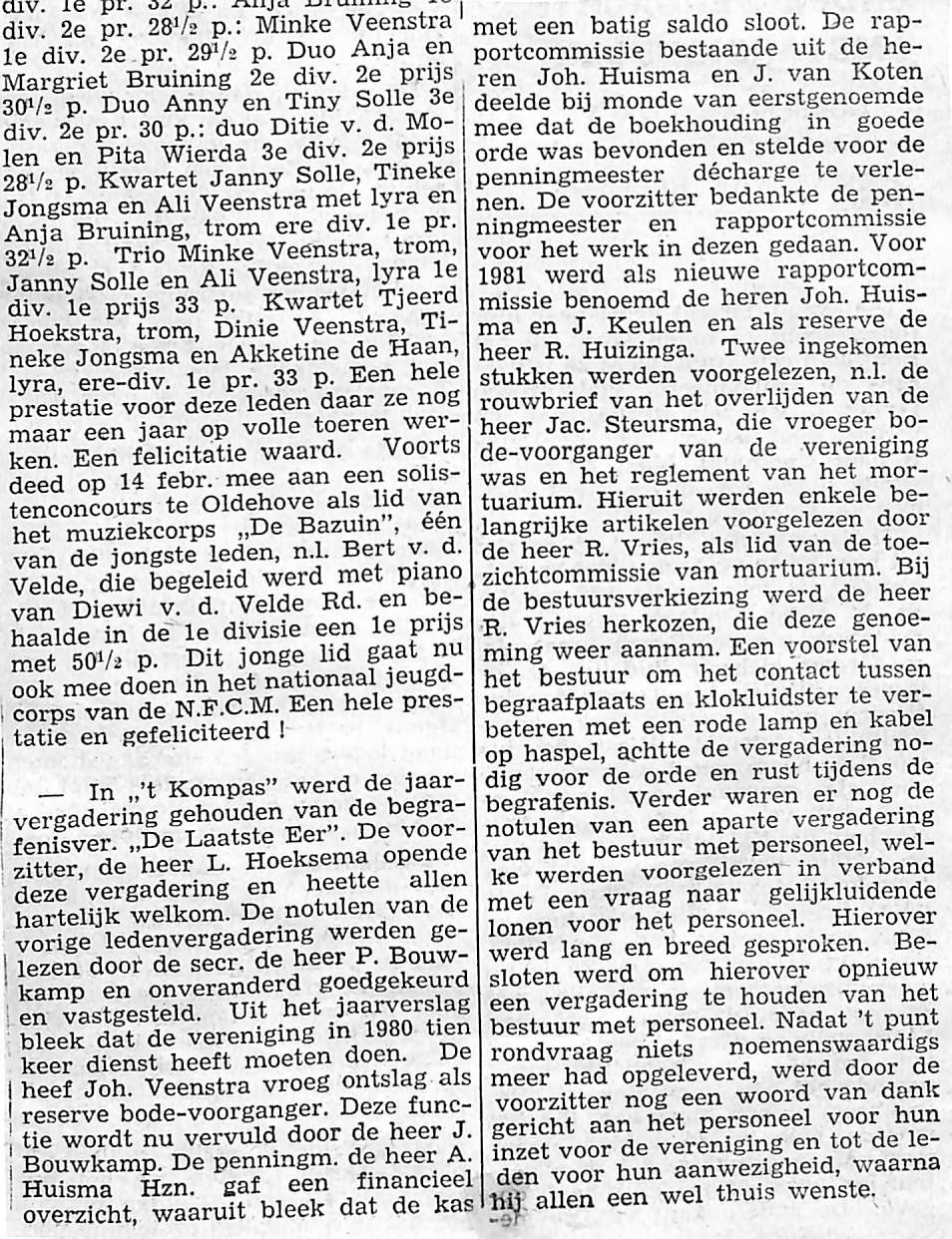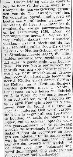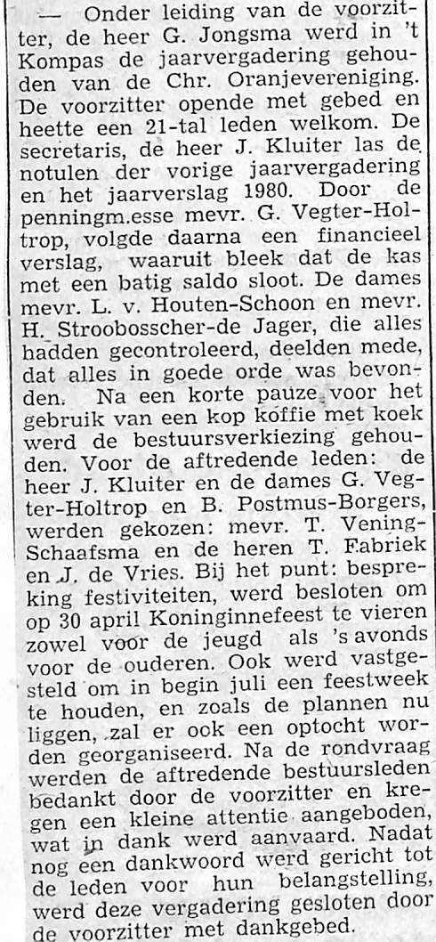 jaarvergadering Chr. Oranjevereniging; Jongsma, Kluiter, Vegter-Holtrop, Houten-Schoon, Strooboscher-de Jager, Postmus-Botgers, Vening-Schaafsma, Fabriek, de Vries,