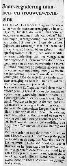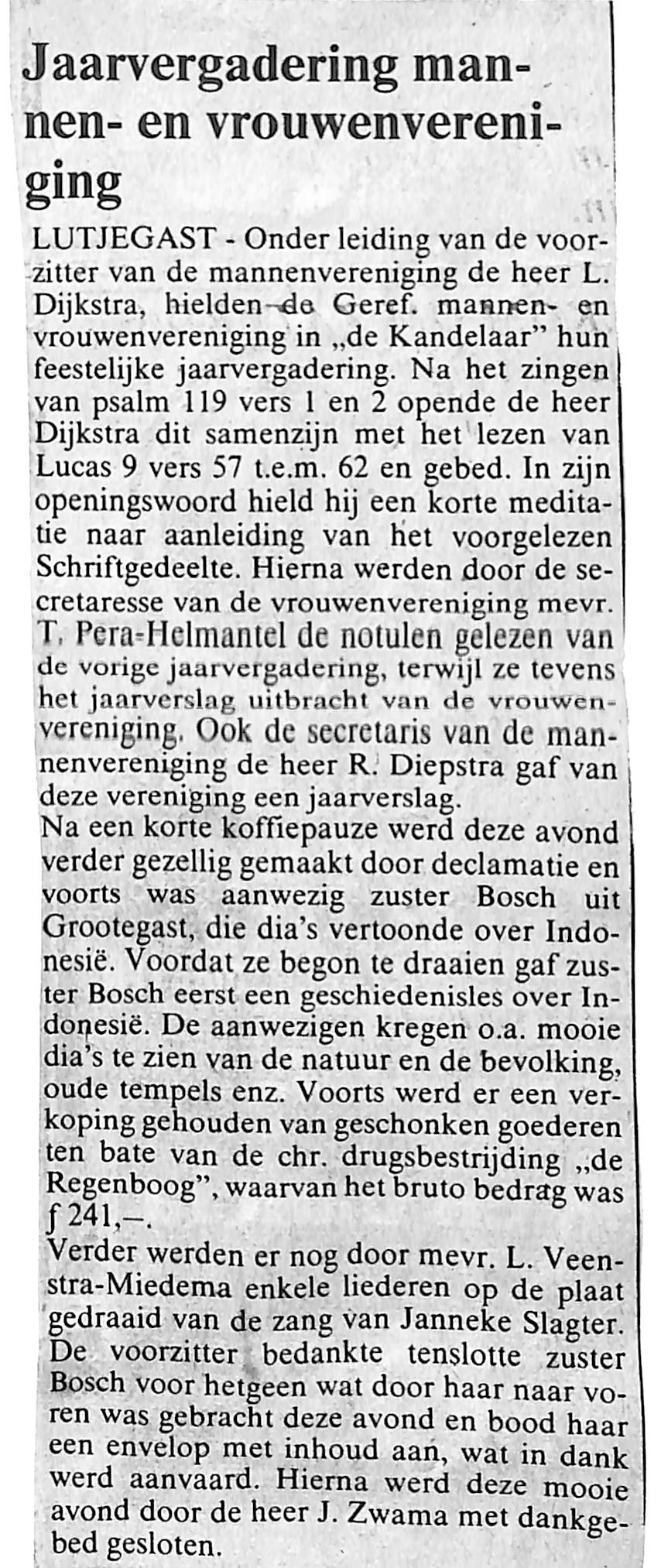 feestelijke jaarvergadering mannen- en vrouwenvereniging; L. Dijkstra, T. Pera-Helmantel, R. Diepstra, Bosch, L. Veenstra-Miedema, Janneke Slagter, J. Zwama