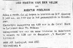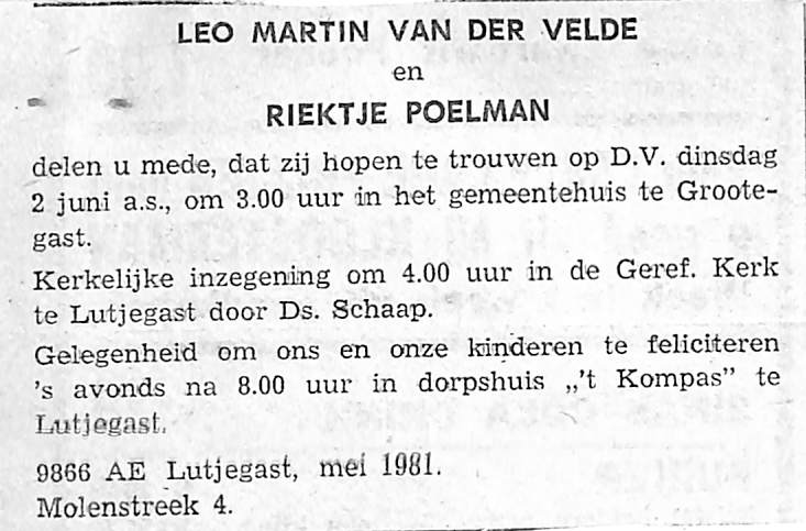 Leo Martin van der Velde en Riektje Poelman huwen 02-06-2081