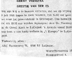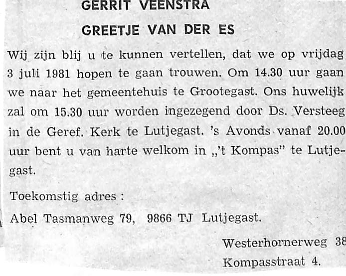 Gerrit Veenstra en Greetje van der Es huwen op 03-07-1981