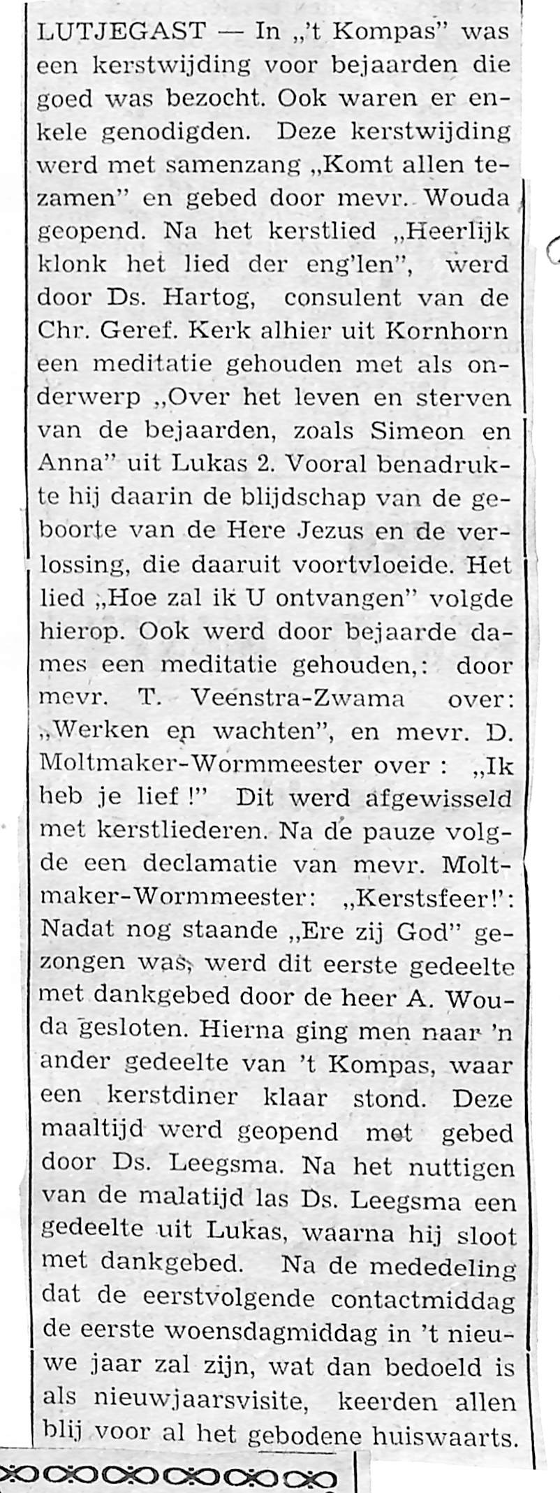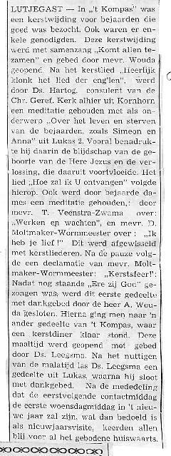 kerstwijding van de bejaardenvereniging, Mevr. Wouda, Ds. Hartog, mevr. T. Veenstra-Zwama, Mevr. D. Moltmaker-Wormmeester, Ds. Leegsma,