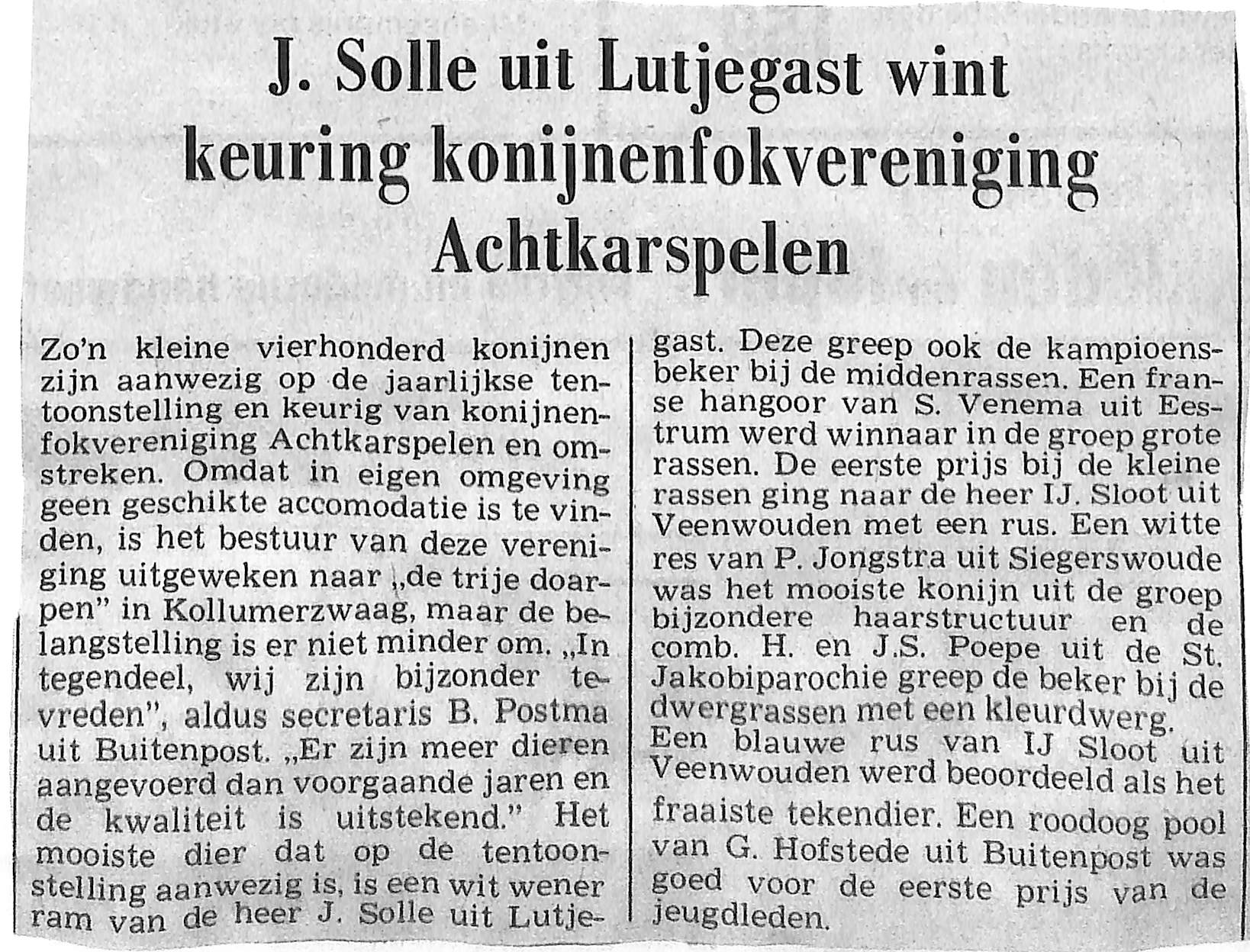 J. Solle wint in Achtkarspelen de eerste prijs op de tentoonstelling.