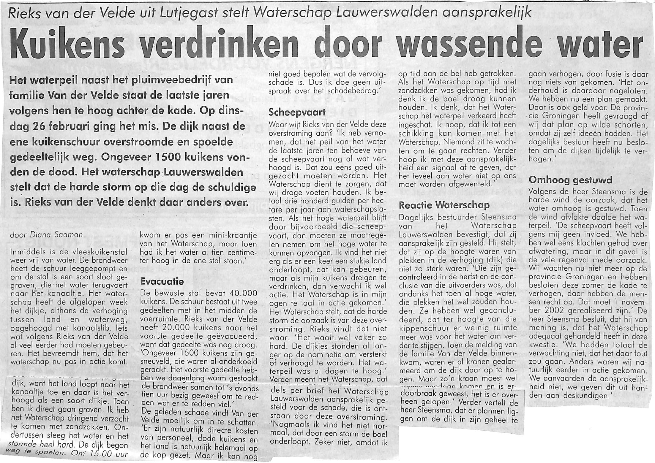 De dijk tussen visvlieterdiep en de kippenboerderij van Rieks van der Velde is overstroomd en ongeveer 1500 kuikens verdronken.