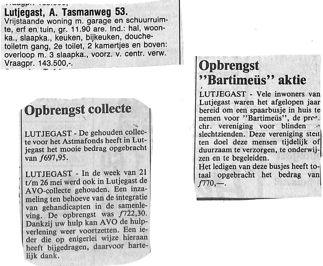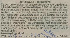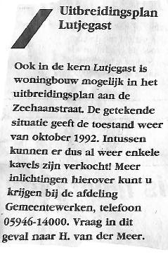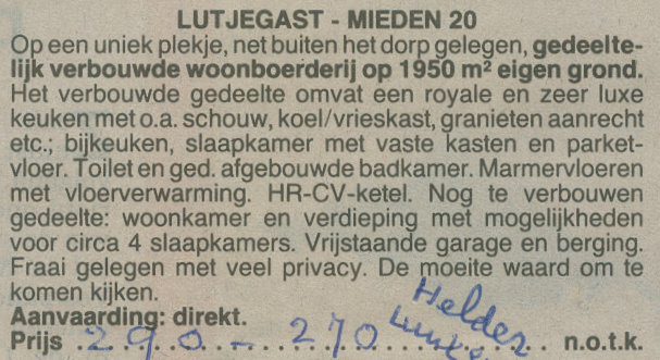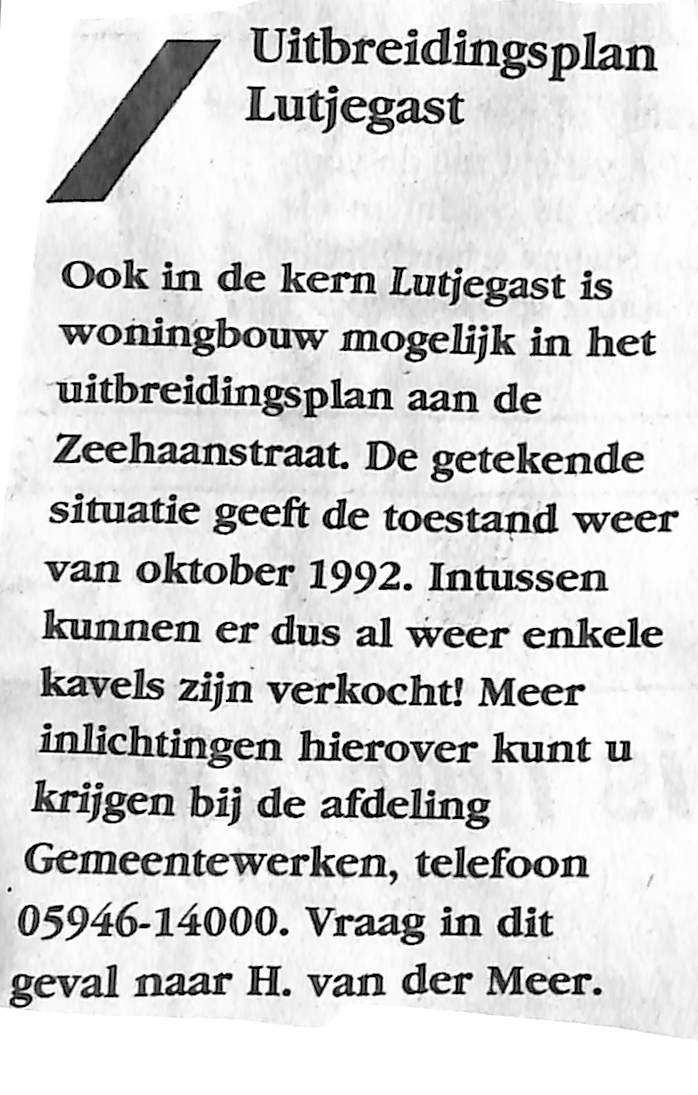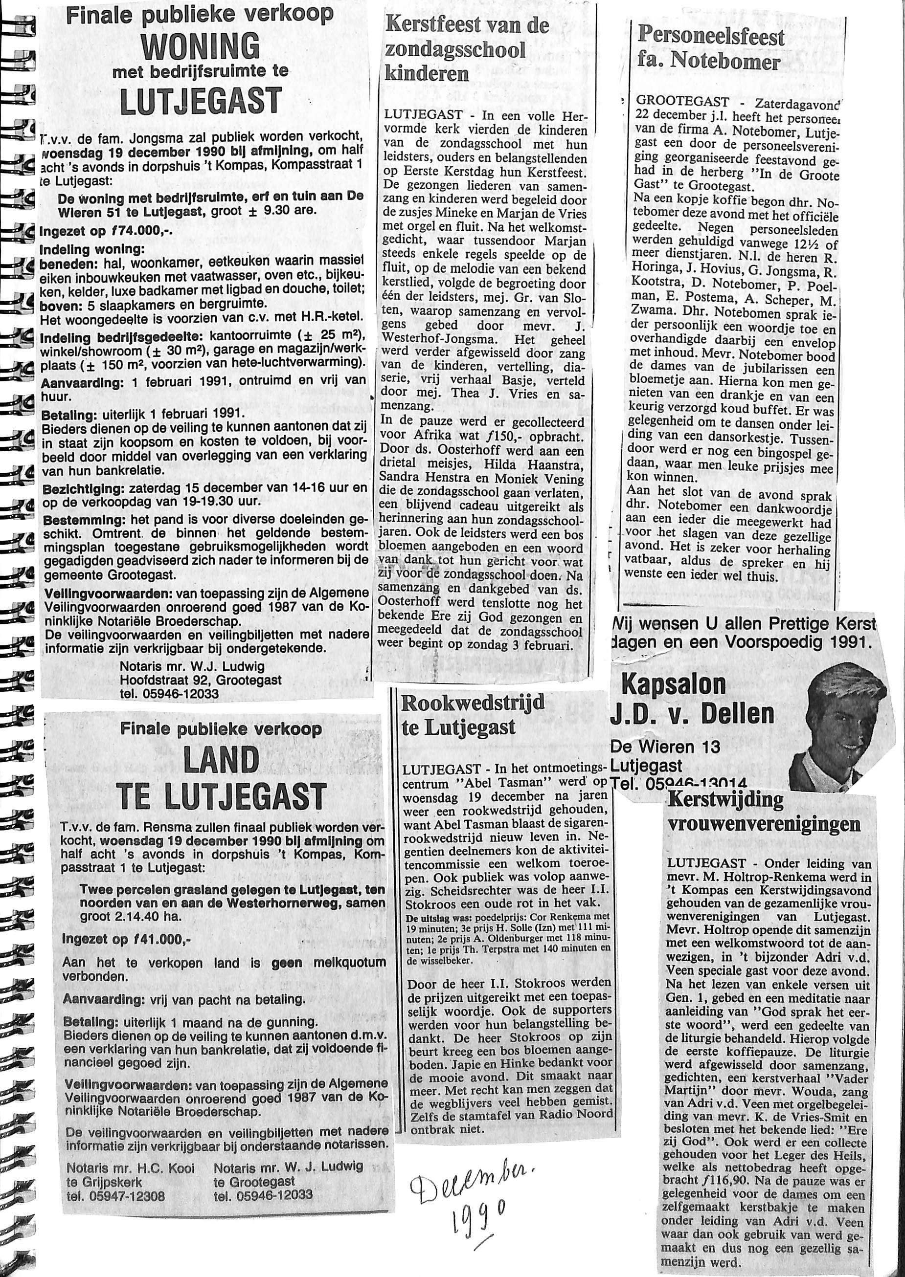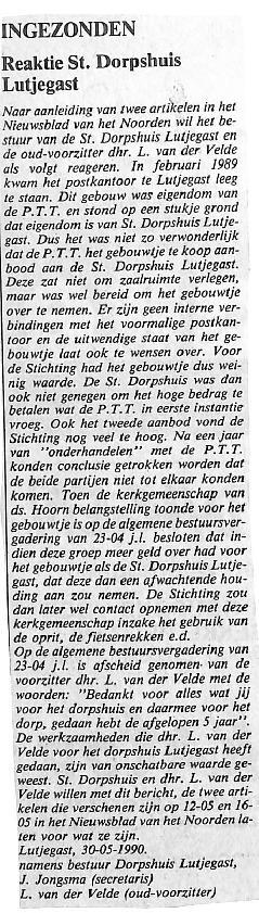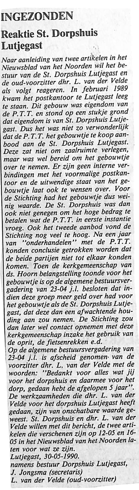 Behandeling verkoop van het oude postkantoor, hiervoor toonde dorpshuis Lutjegast en de kerkgemeenschap van ds. Hoorn interesse. Op de bestuursvergadering van Dorpshuis Lutjegast werd afscheid genomen van dhr. L. van der Velde.