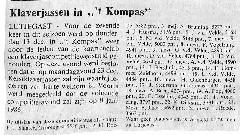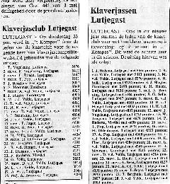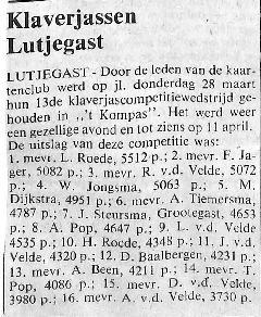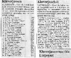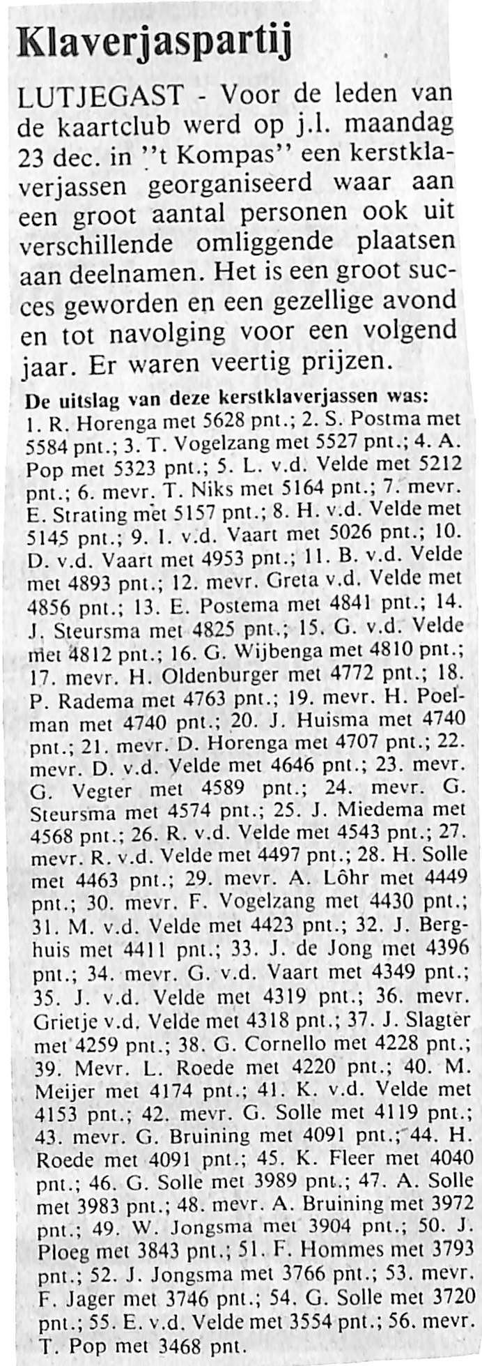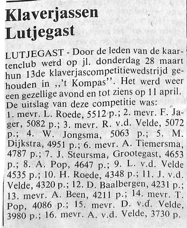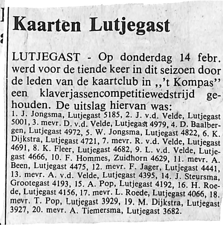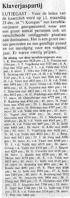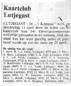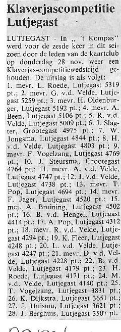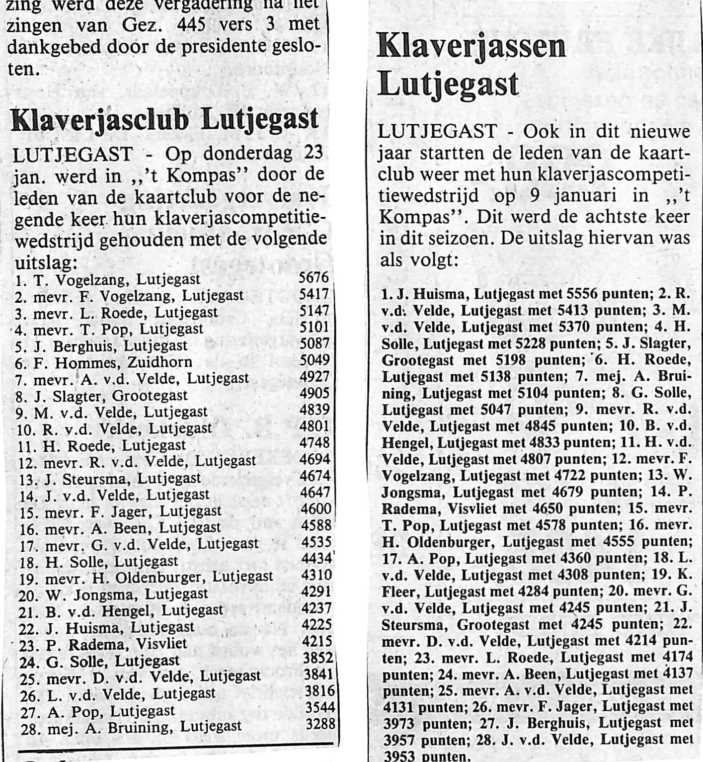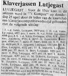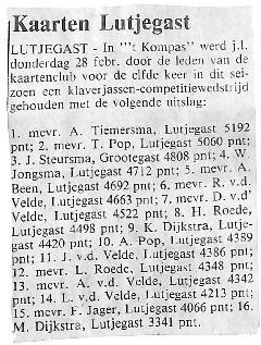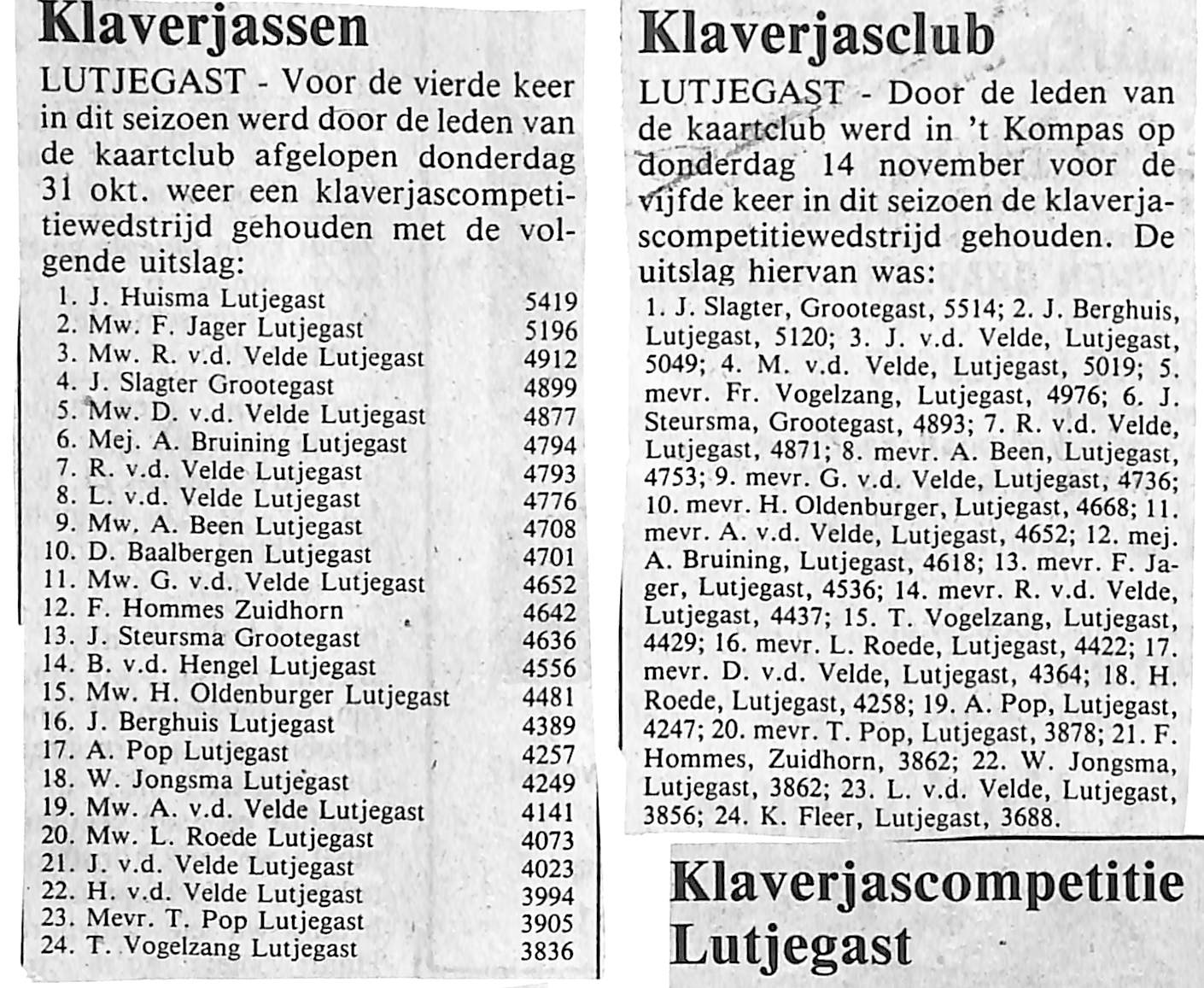 uitslagen 4de en 5de klaverjascompetitiewedstrijd; J. Huisma, F. Jager, R. v/d Velde, J. Slagter, D. v/d Velde, A. Bruining, R/ v/d Velde, L. v/d Velde, A. Been, D. Baalbergen, G. v/d Velde, F. Hommes, J. Steursma, B. v/d Hengel, H. Oldenburger, J. Berghuis, A. Pop, W. Jongsma, A.v/d Velde, L. Roede, J. V/d Velde, H. v/d Velde, T. Pop, T. Vogelzang