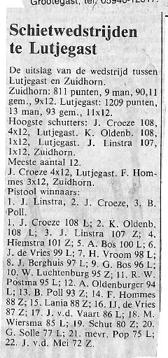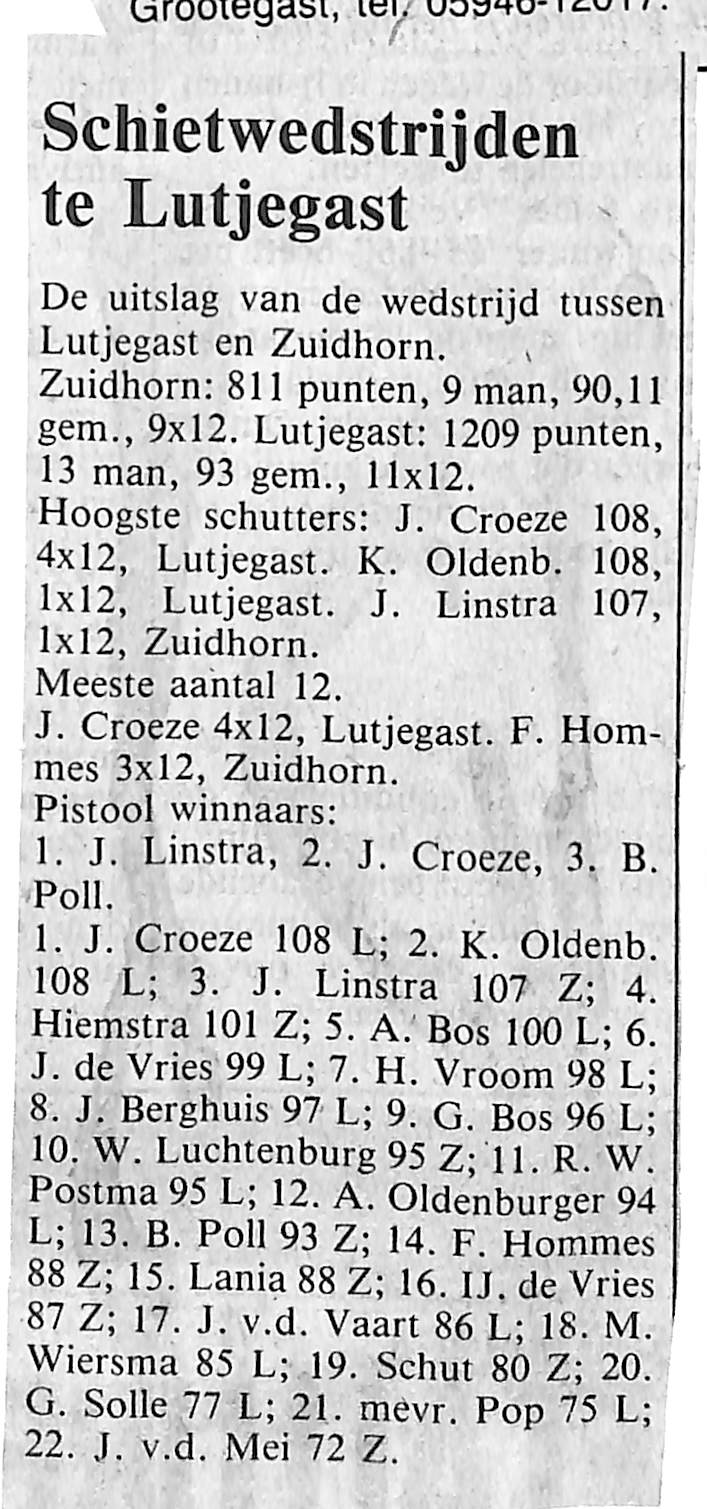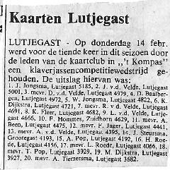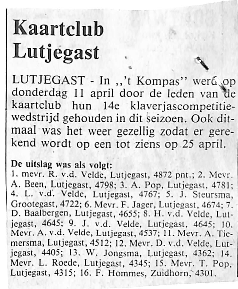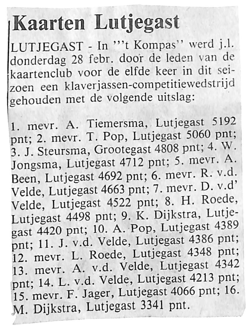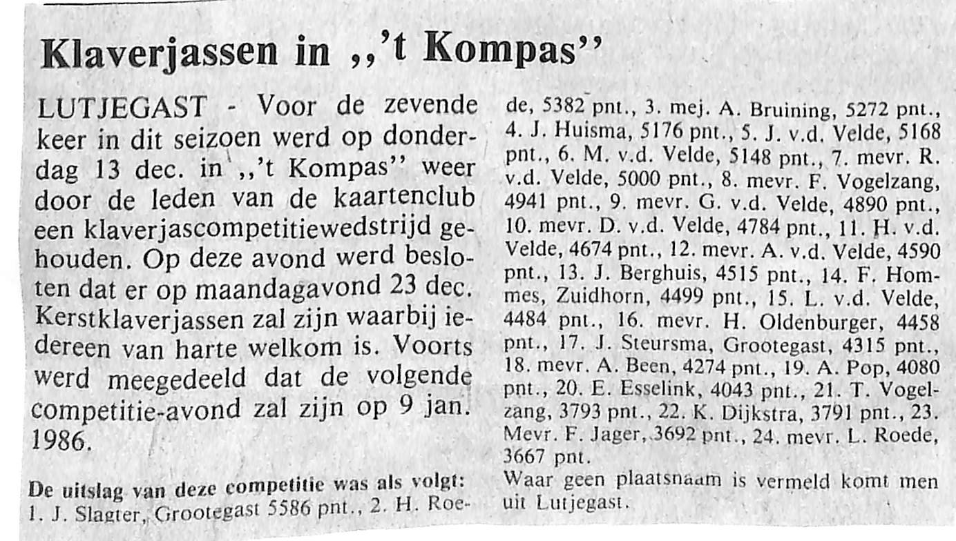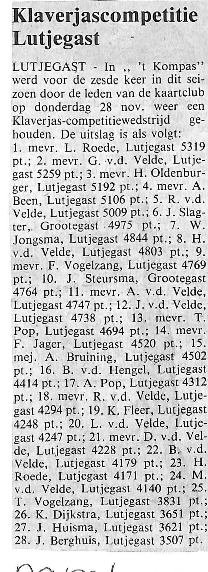 uitslag 6de klaverjascompetitiewedstrijd; J. Huisma, F. Jager, R. v/d Velde, J. Slagter, D. v/d Velde, A. Bruining, R/ v/d Velde, L. v/d Velde, A. Been, D. Baalbergen, G. v/d Velde, F. Hommes, J. Steursma, B. v/d Hengel, H. Oldenburger, J. Berghuis, A. Pop, W. Jongsma, A.v/d Velde, L. Roede, J. V/d Velde, H. v/d Velde, T. Pop, T. Vogelzang