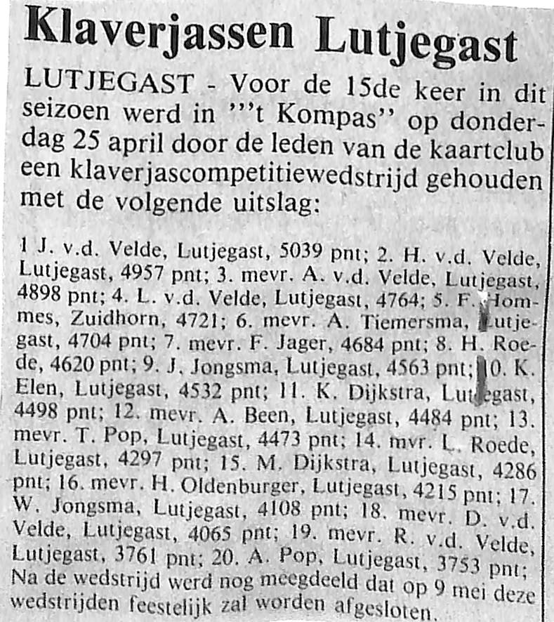 uitslag 9de klaverjascompetitiewedstrijd; J. Huisma, F. Jager, R. v/d Velde, J. Slagter, D. v/d Velde, A. Bruining, R/ v/d Velde, L. v/d Velde, A. Been, D. Baalbergen, G. v/d Velde, F. Hommes, J. Steursma, B. v/d Hengel, H. Oldenburger, J. Berghuis, A. Pop, W. Jongsma, A.v/d Velde, L. Roede, J. V/d Velde, H. v/d Velde, T. Pop, T. Vogelzang