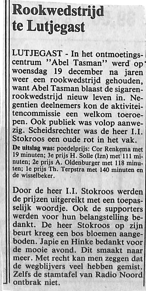Sigarenrookwedstrijd met prijswinnaars: C. Renkema, H. Solle, A. Oldenburger, Th. Terpstra. Uitgereikd door I.I. Stokroos. Mede verzorgd door J. en H. de Vries.