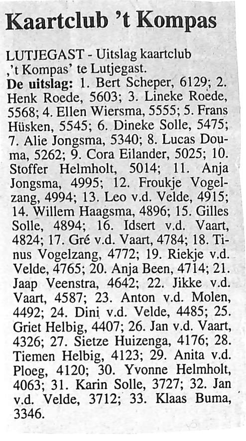 Solle, Hiemstra, Boonstra, Helbig, Jongsma, Vogelzang, Roede, v.d. Vaart, v.d. Molen, Hüsken, Mulder, Pop, Helmholt, Douma, Pop, Buiter, Haagsma, van Dellen, v.d. Velde, Scheper, Tuinstra, Huizinga, Eilander, Boonstra, Been, Veenstra