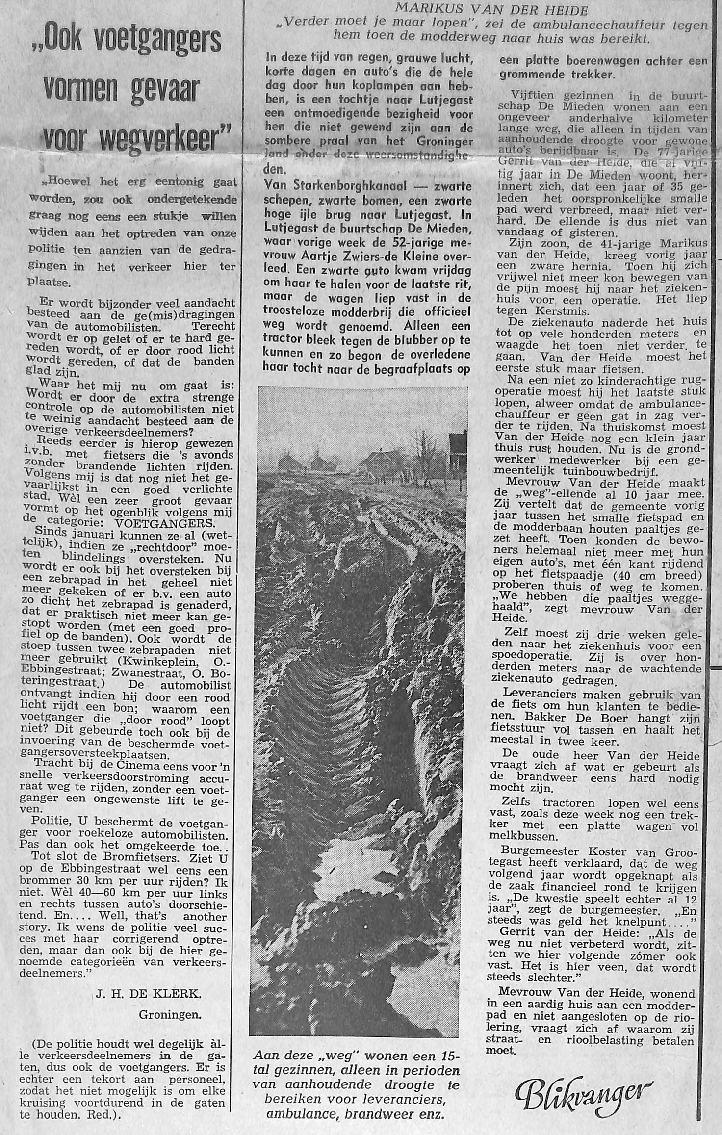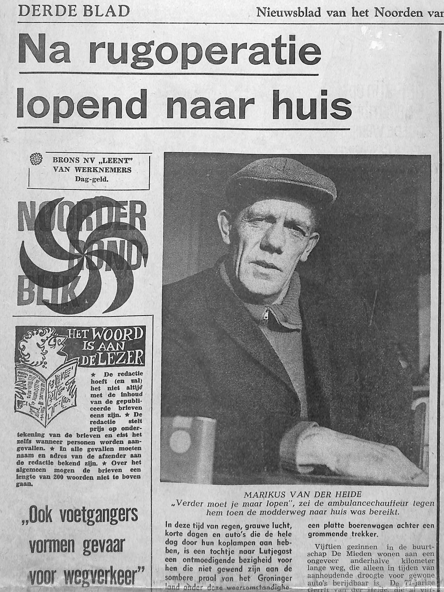 Marikus van der Heide woonde Mieden 15 oud. Hij was aan zijn rug geopereerd maar de ziekenwagen kon de Mieden modderweg niet berijden dus lopend naar huis.