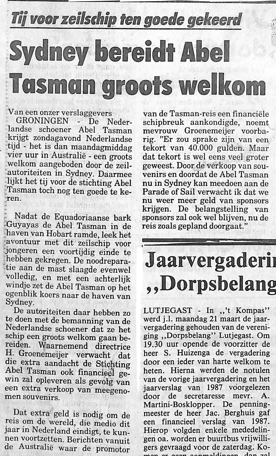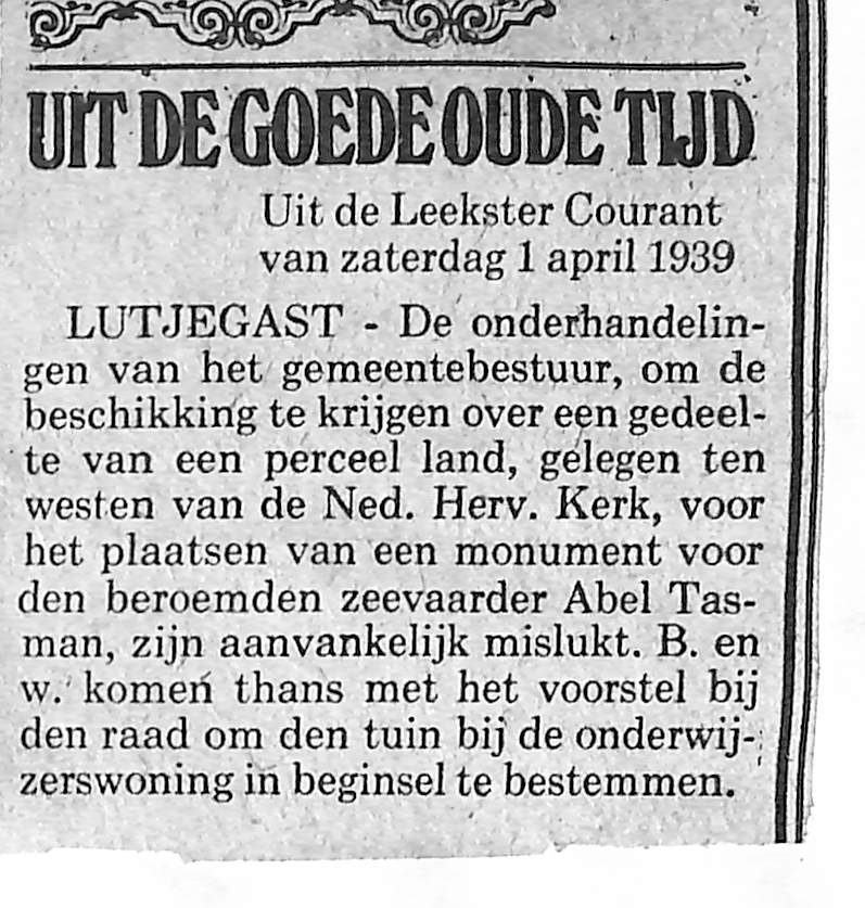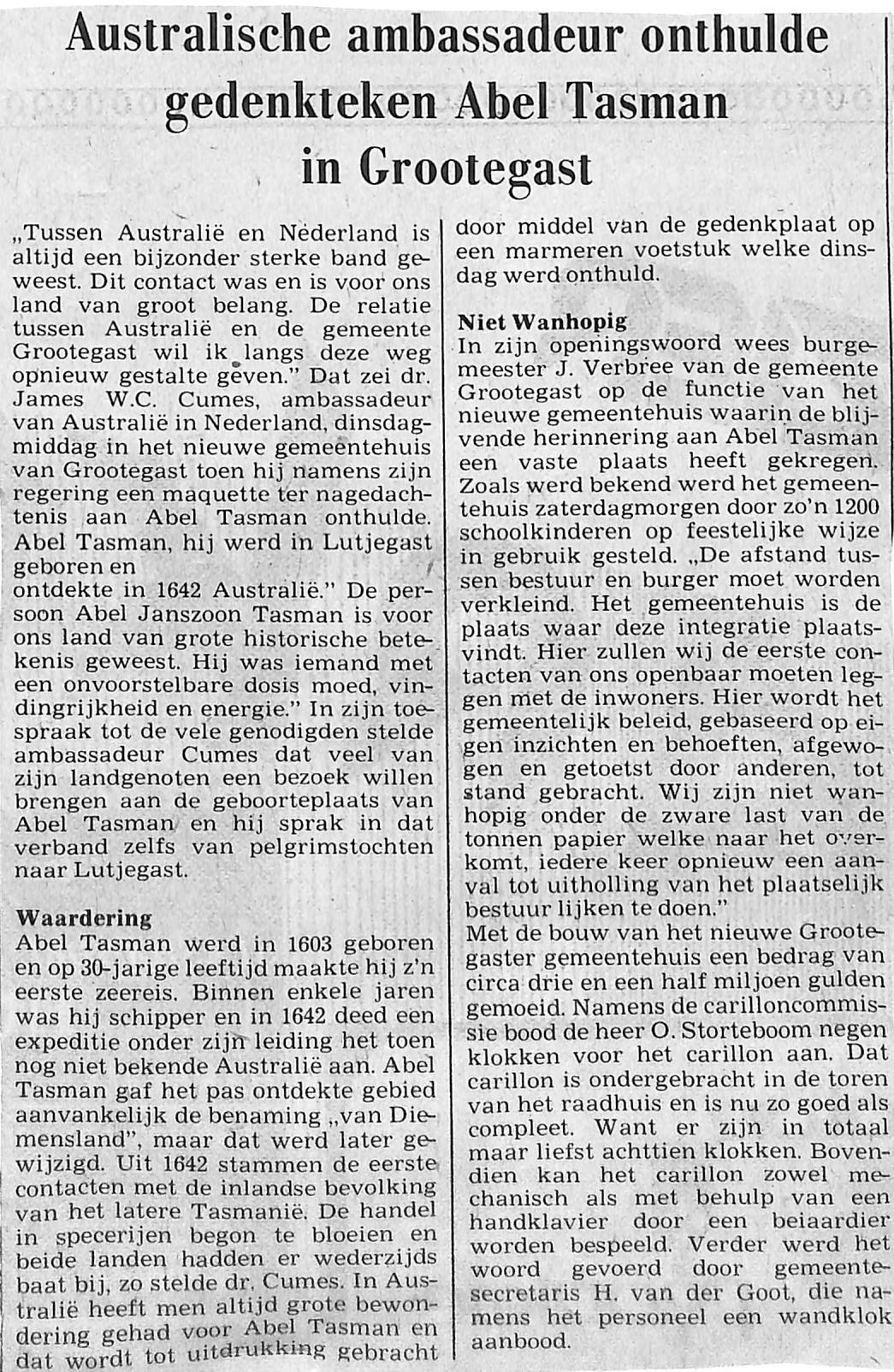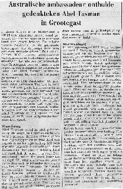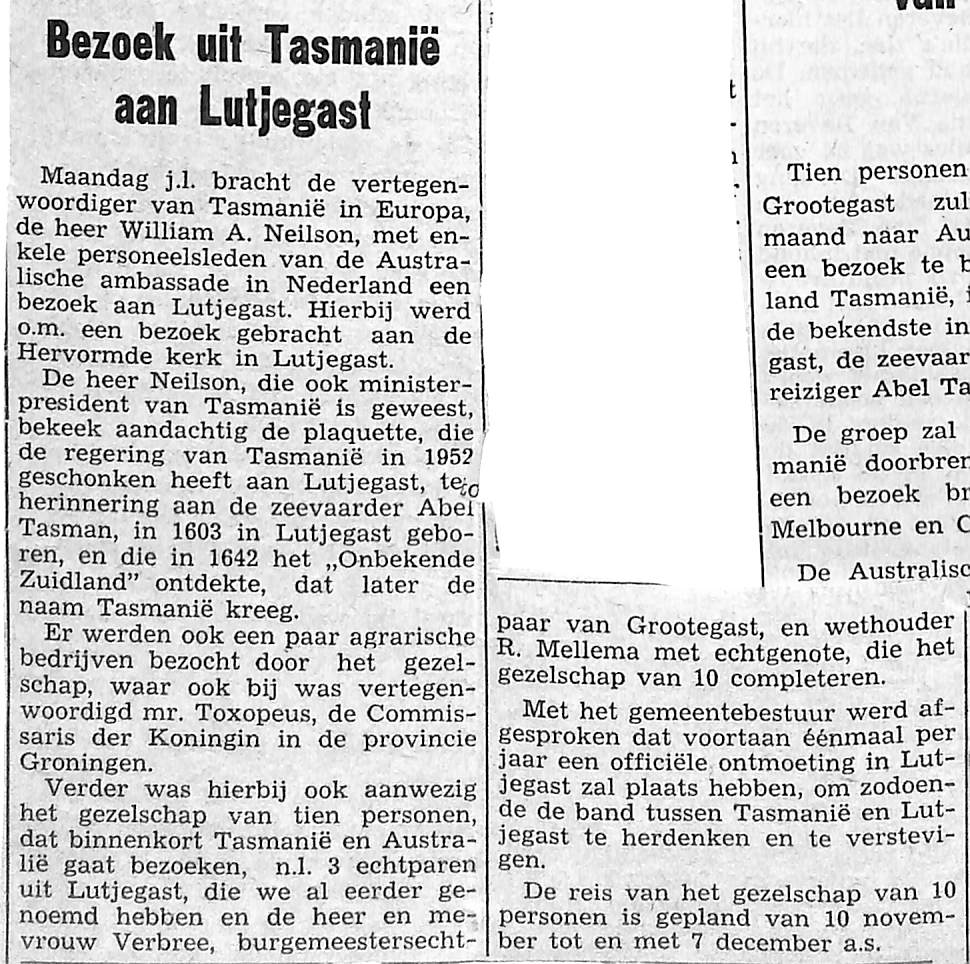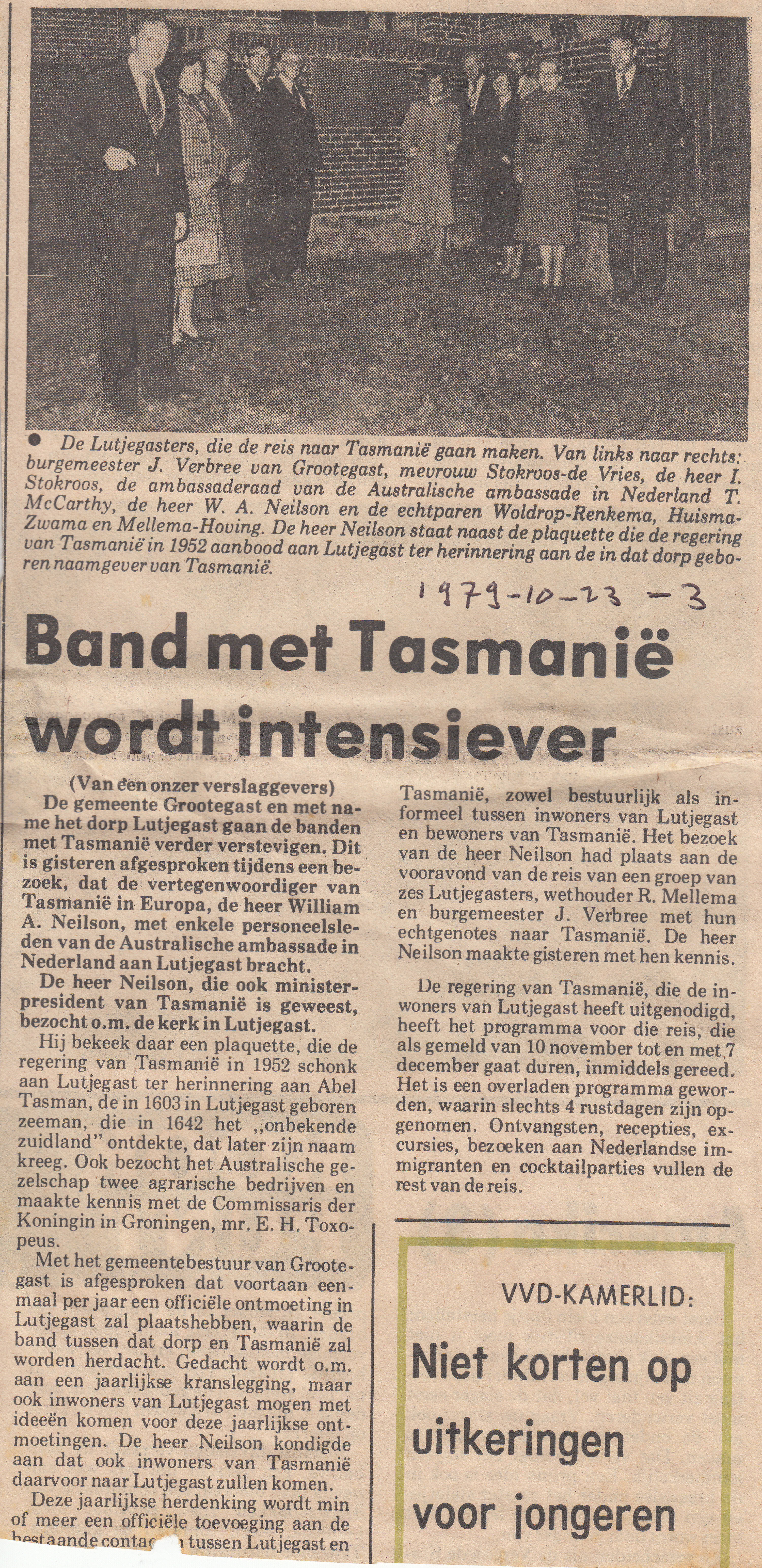Ambassadeur Nieuw Zeeland bezoekt o.a. Lutjegast omdat Abel Tasman 327 jaar geleden voet aan wal zette in Melson, N.Z. Is daar nationale feestdag