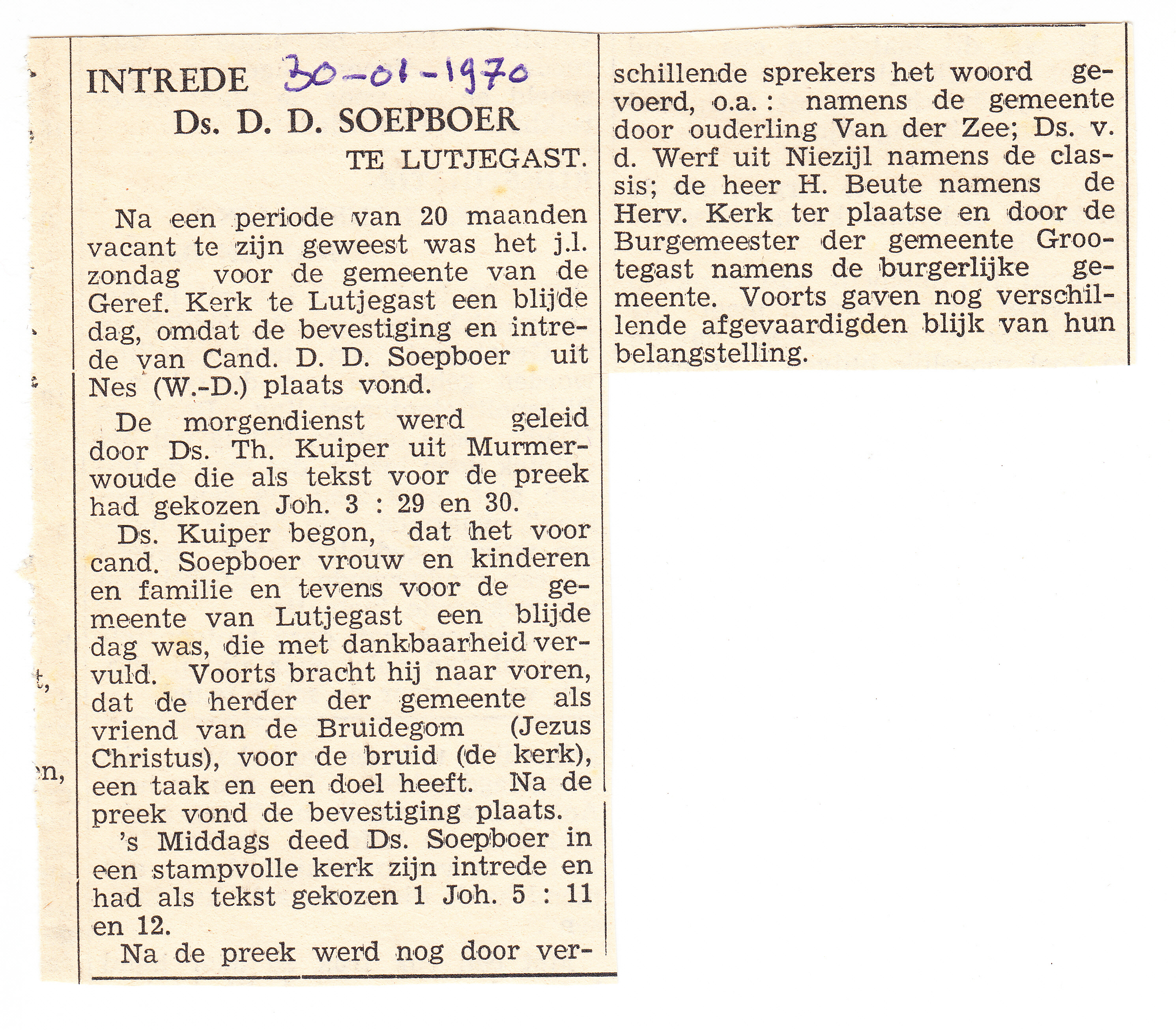 Intrede van Ds. Soepboer, Ds. Th. Kuiper, Van der Zee, H. Beute