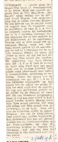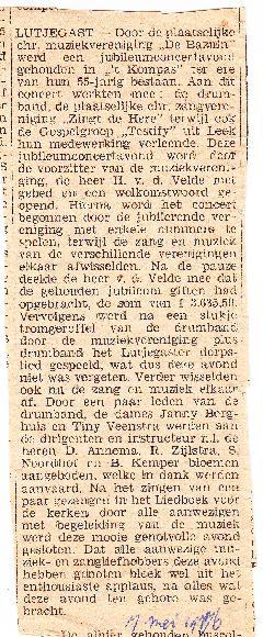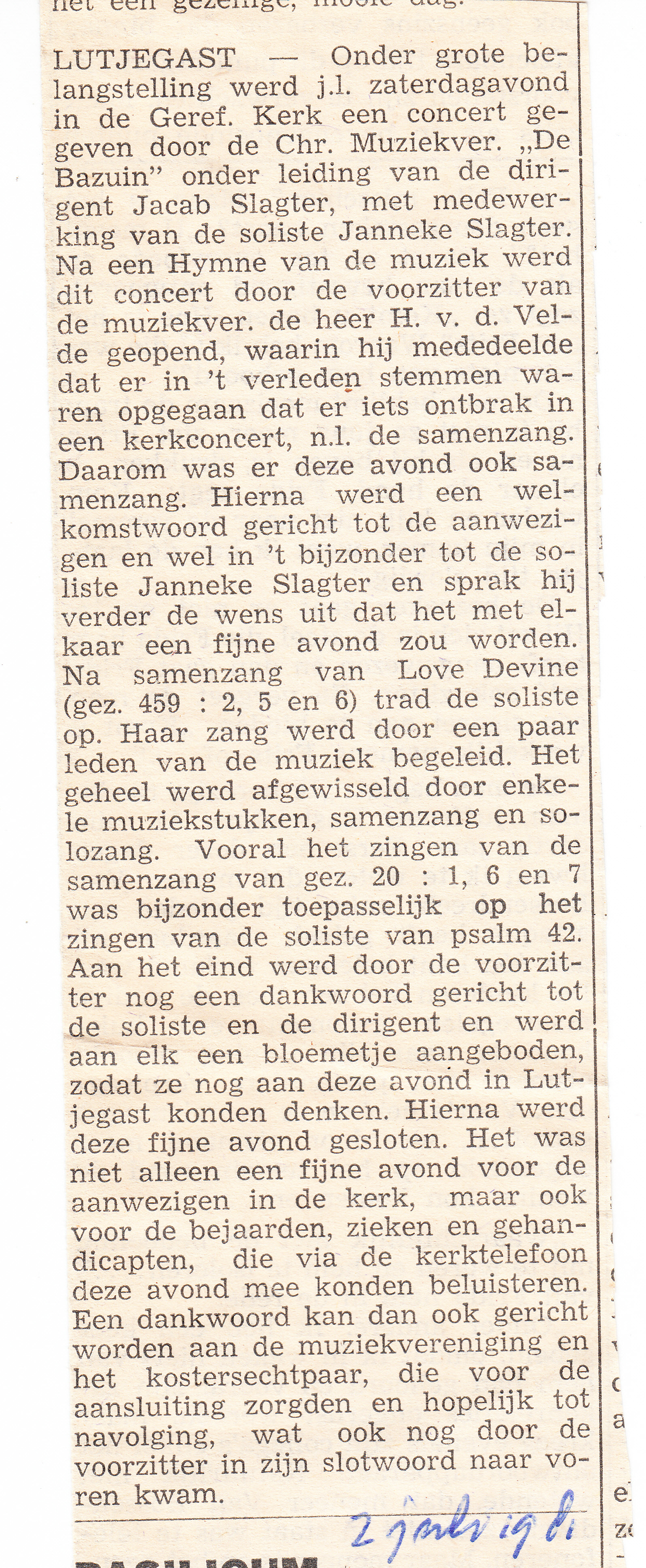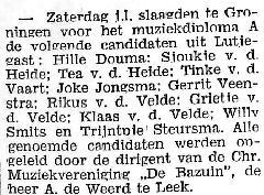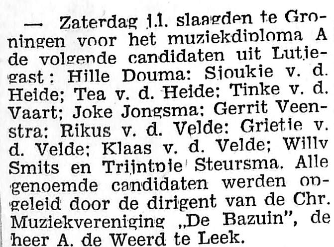Hille Douma, Sjoukje v.d. Heide, Thea v.d. Heide, Tineke v.d. Vaart, Joke Jongsma, Grietje v.d. Velde, Klaas v.d. Velde, Willy Smits, Trijntje Steursma, Allemaal leden van De Bazuin. A. de Weerd.