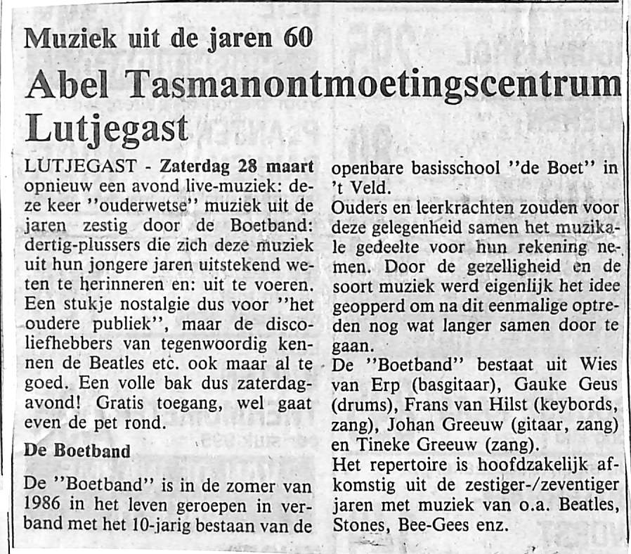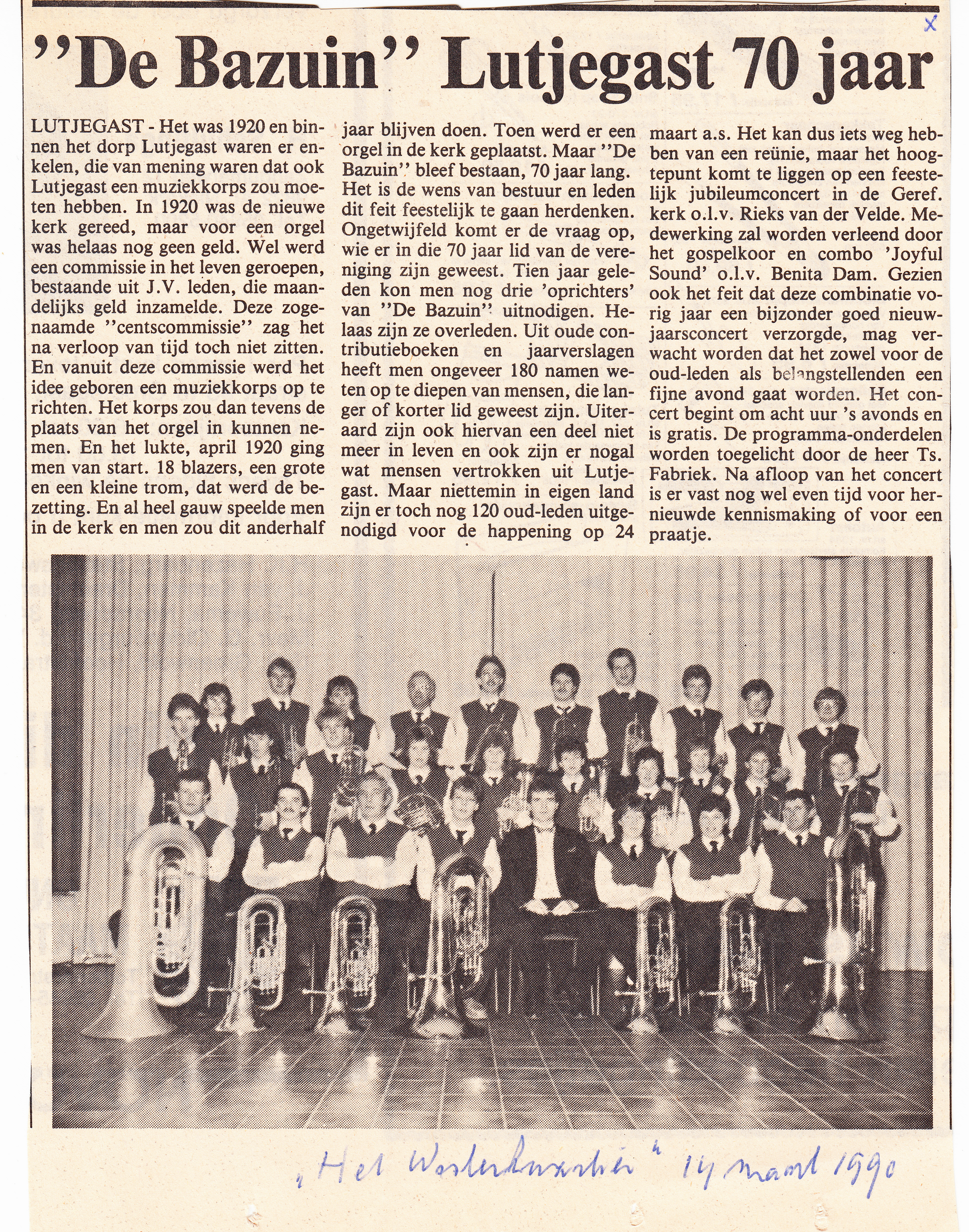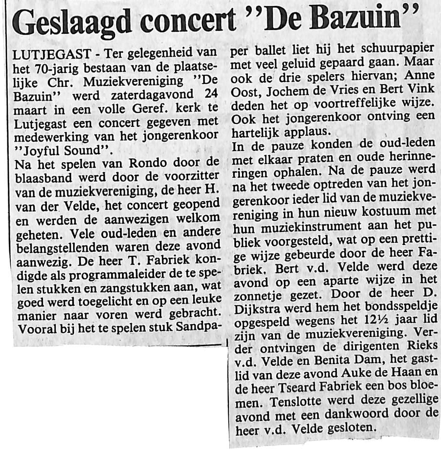 ter gelegenheid van het 70-jarig bestaan van de Muziekvereniging De Bazuin werd er een concert gegeven; H v/d velde, T. Fabriek, Anne Oost, Jochum de Vries, Bert Vink, Bert v/d Velde, D. Dijkstra, Rieks v/d Velde, Benita Dam, Auke de Haan,