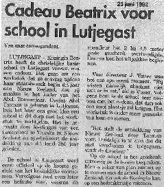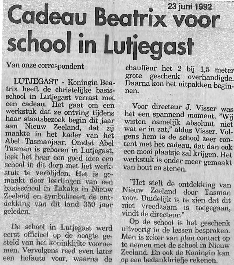 Beatrix ontving een werkstuk tijdens bezoek aan Nieuw Zeeland. J. Visser directeur chr. basisschool