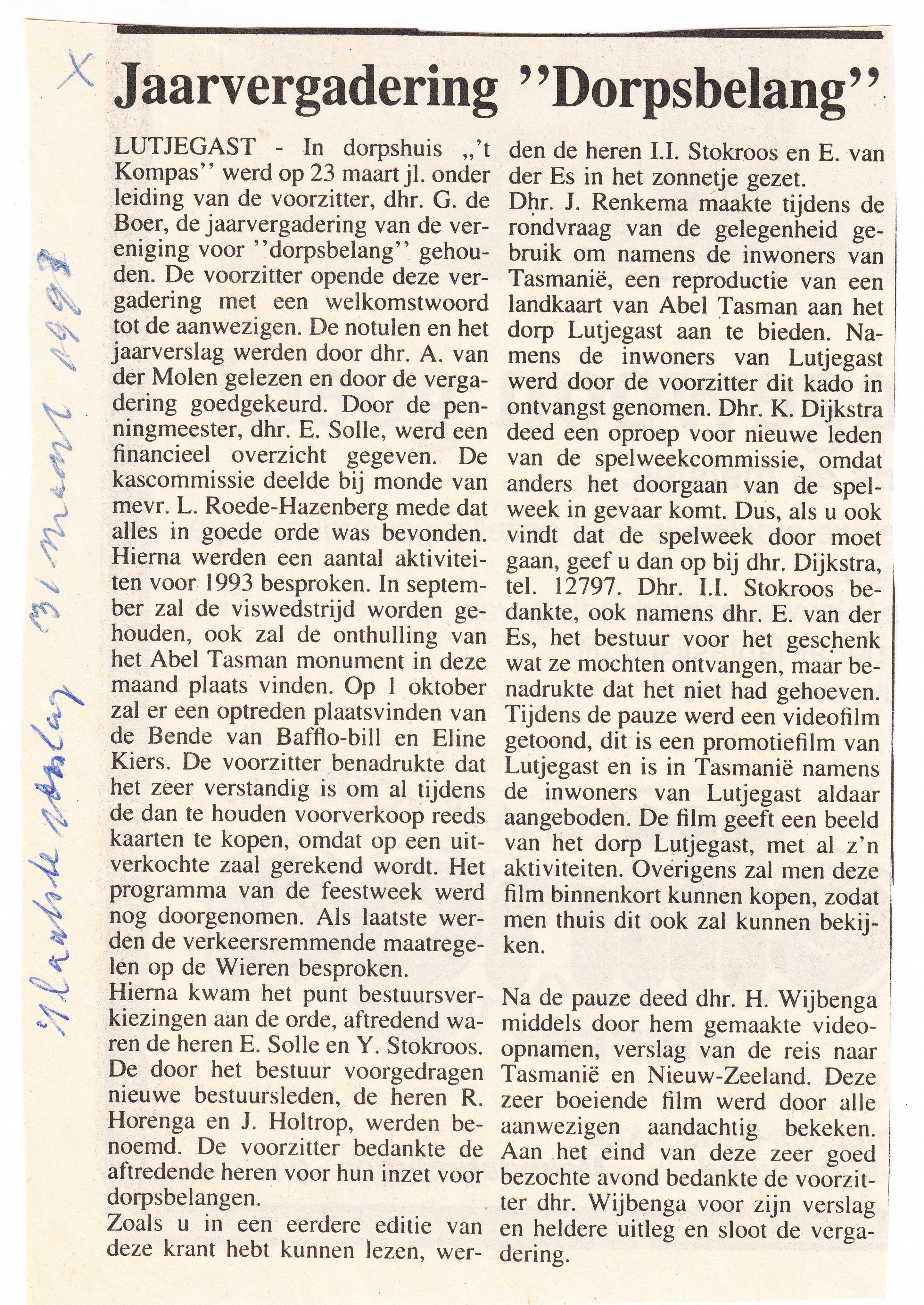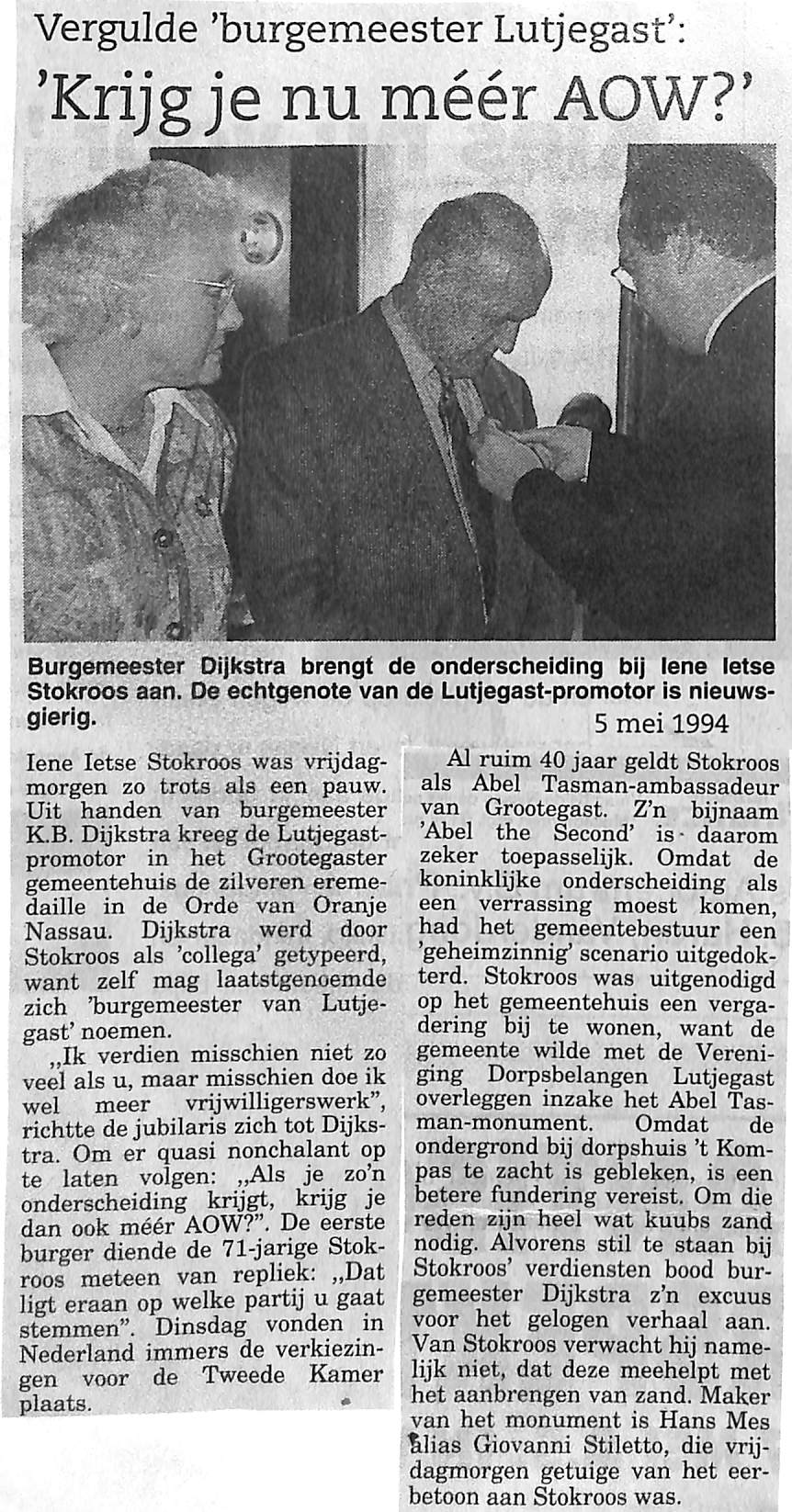 I.I.Stokroos kreeg onderscheiding in zilver voor al het werk wat hij gedaan heeft voor Abel Tasman en Lutjegast.