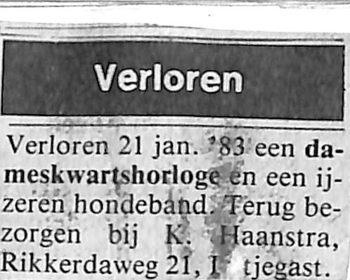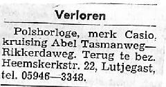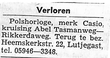 polshorloge, merk Casio, kruising A.Tasmanweg-Rikkerdaweg, terug te bezorgen Heemskerkstr.22 Lutegast