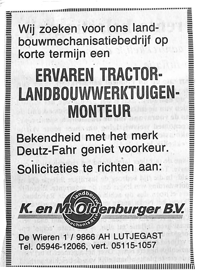 Oldenburger zoekt goede monteur, kennis van Deutz-Fahr geniet de voorkeur.