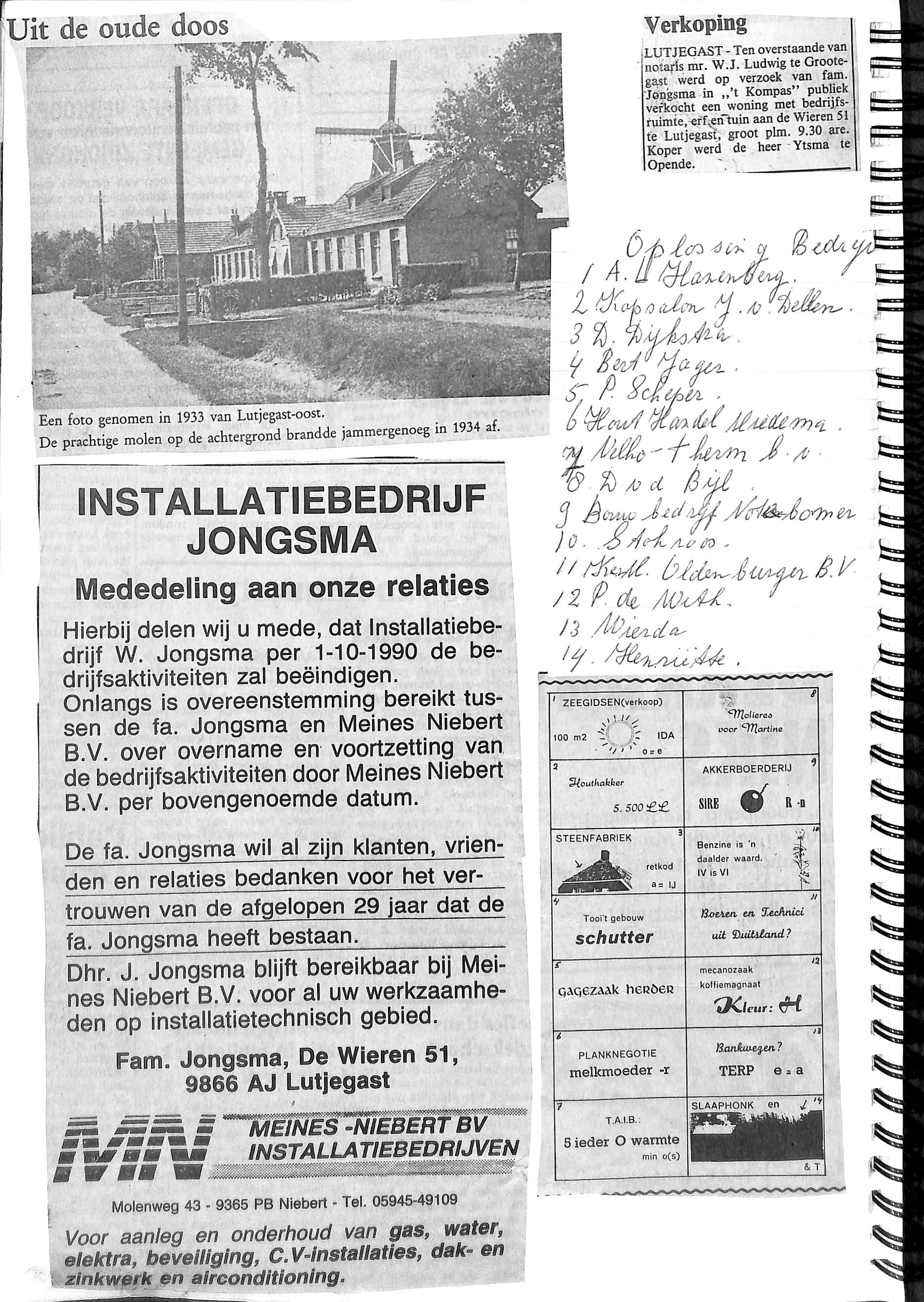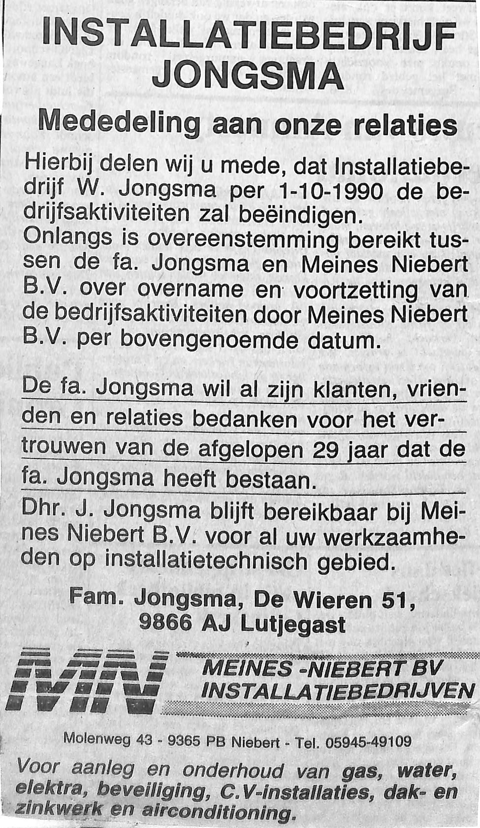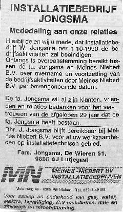 W. Jongsma, stopt per 01-10-1990 zijn bedrijf. Meines-Niebert neemt het over